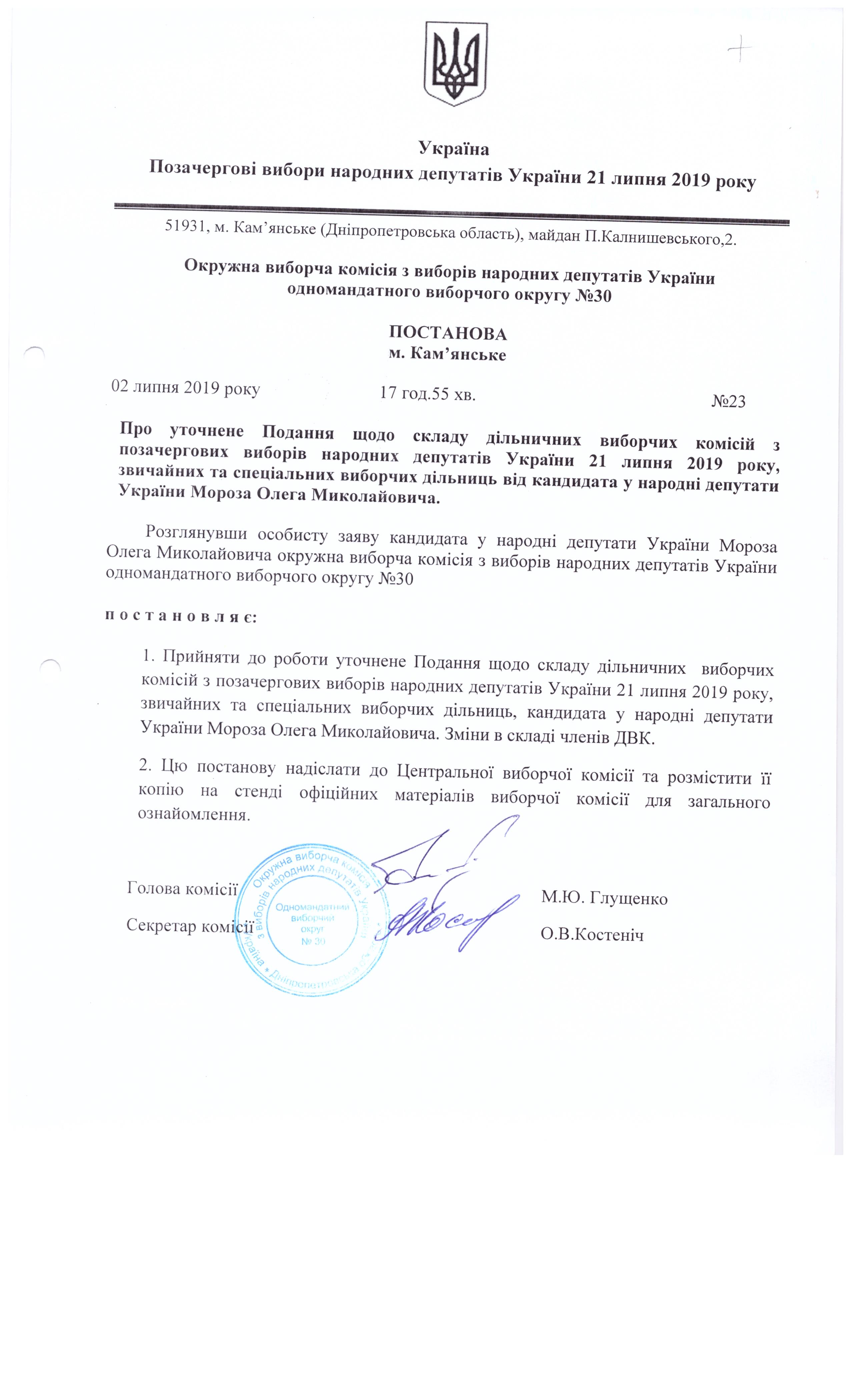 Про уточнене подання щодо складу дільничних виборчих комісій з позачергових виборів депутатів України 21 липня 2019 р. звичайних та спеціальних виборчих дільниць від кандидата у народні депутати України Мороза Олега Миколайовича |