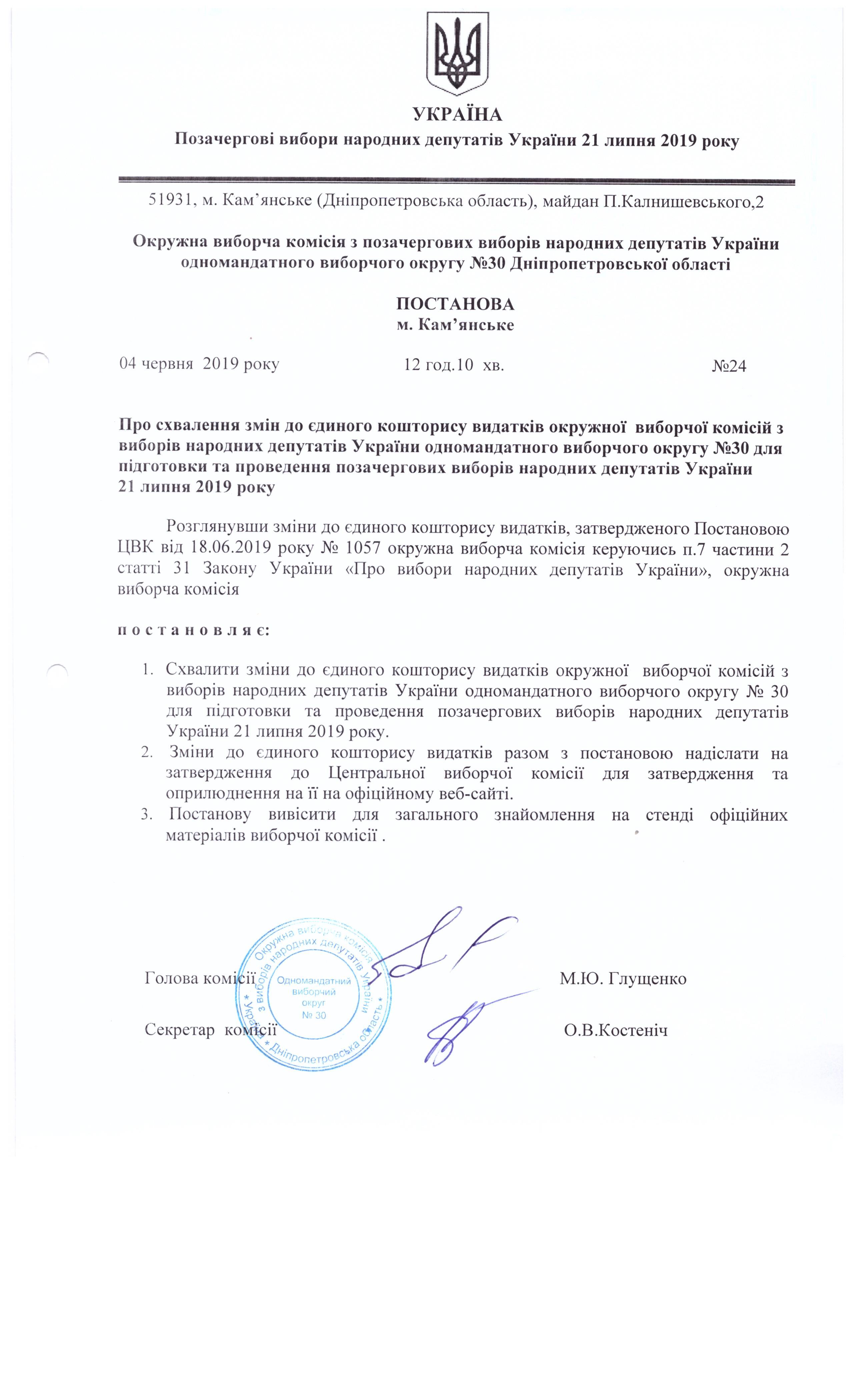 Про схвалення змін до єдиного кошторису видатків окружної виборчої комісії № 30 |