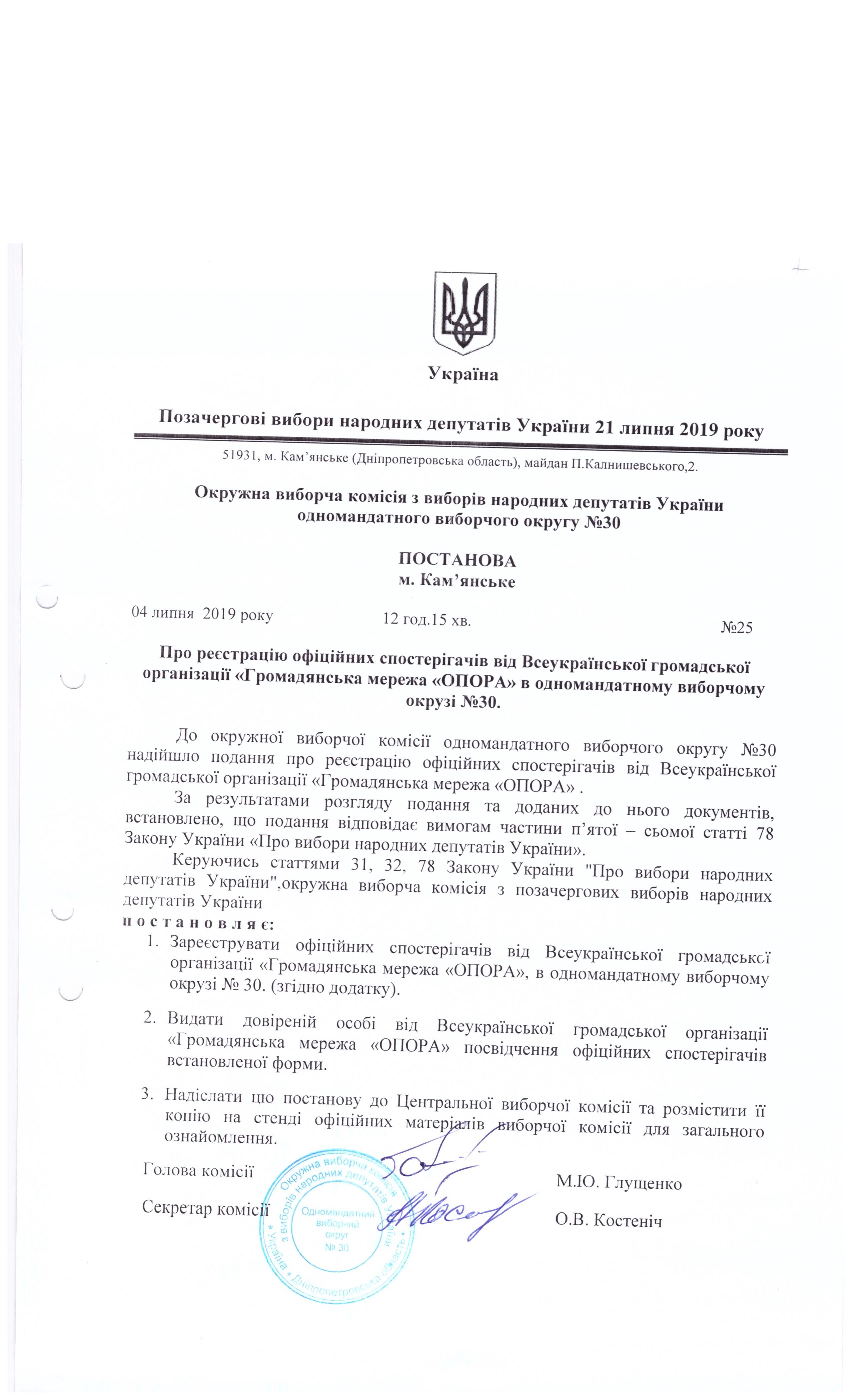 Про реєстрацію офіційних спостерігачів від ГО Моніторингова місія за виборами в Україні у 2019 році" в одномандатному виборчому окрузі №30 |