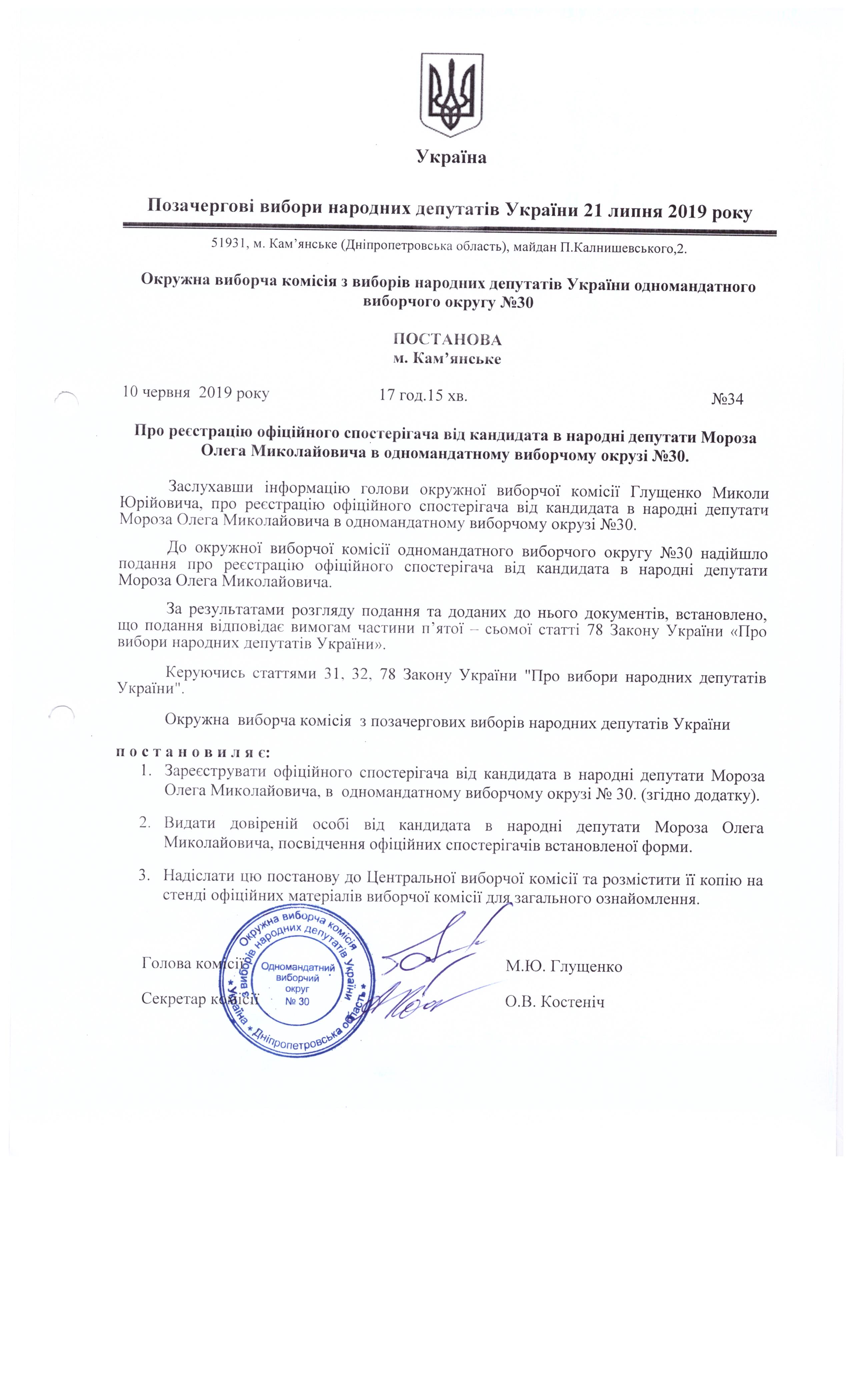 Про реєстрацію офіційного спостерігача від кандидата в народні депутати Мороза Олега Миколайовича в одномандатному виборчому окрузі №30 |