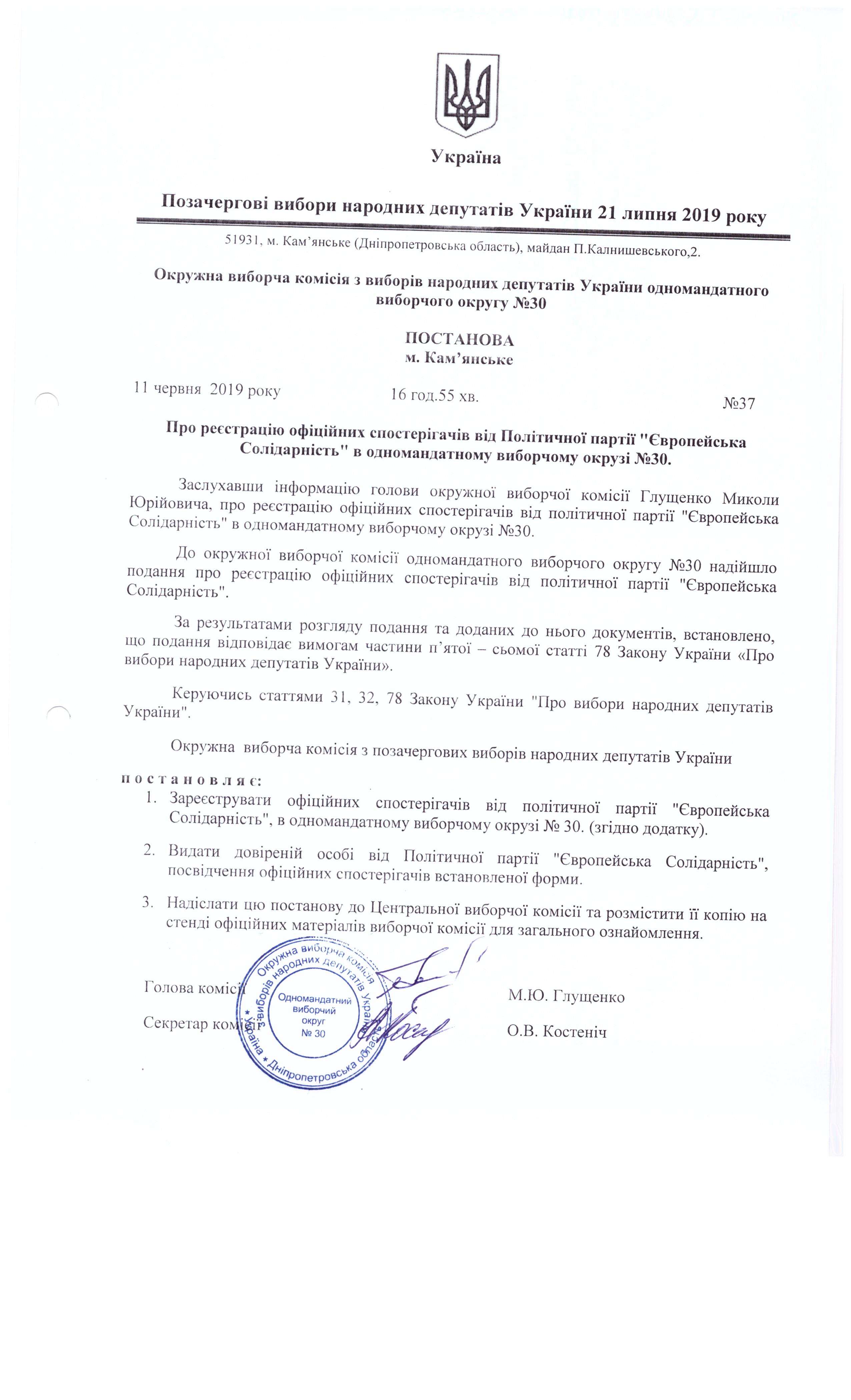 Про реєстрацію офіційного спостерігача від Політичної партії "Європейська Солідарність" в одномандатному виборчому окрузі №30 |