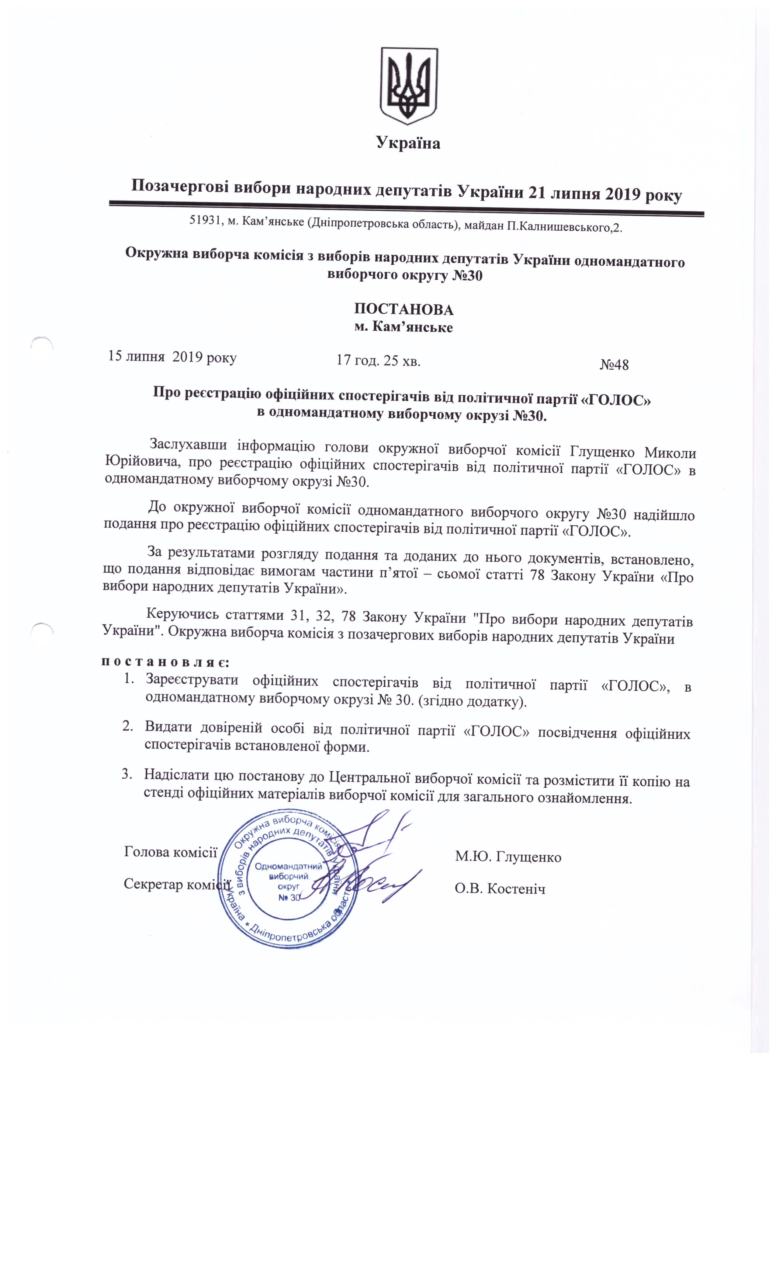 Про реєстрацію офіційних спостерігачів від Політичної партії "ГОЛОС" в одномандатному виборчому окрузі №30 |