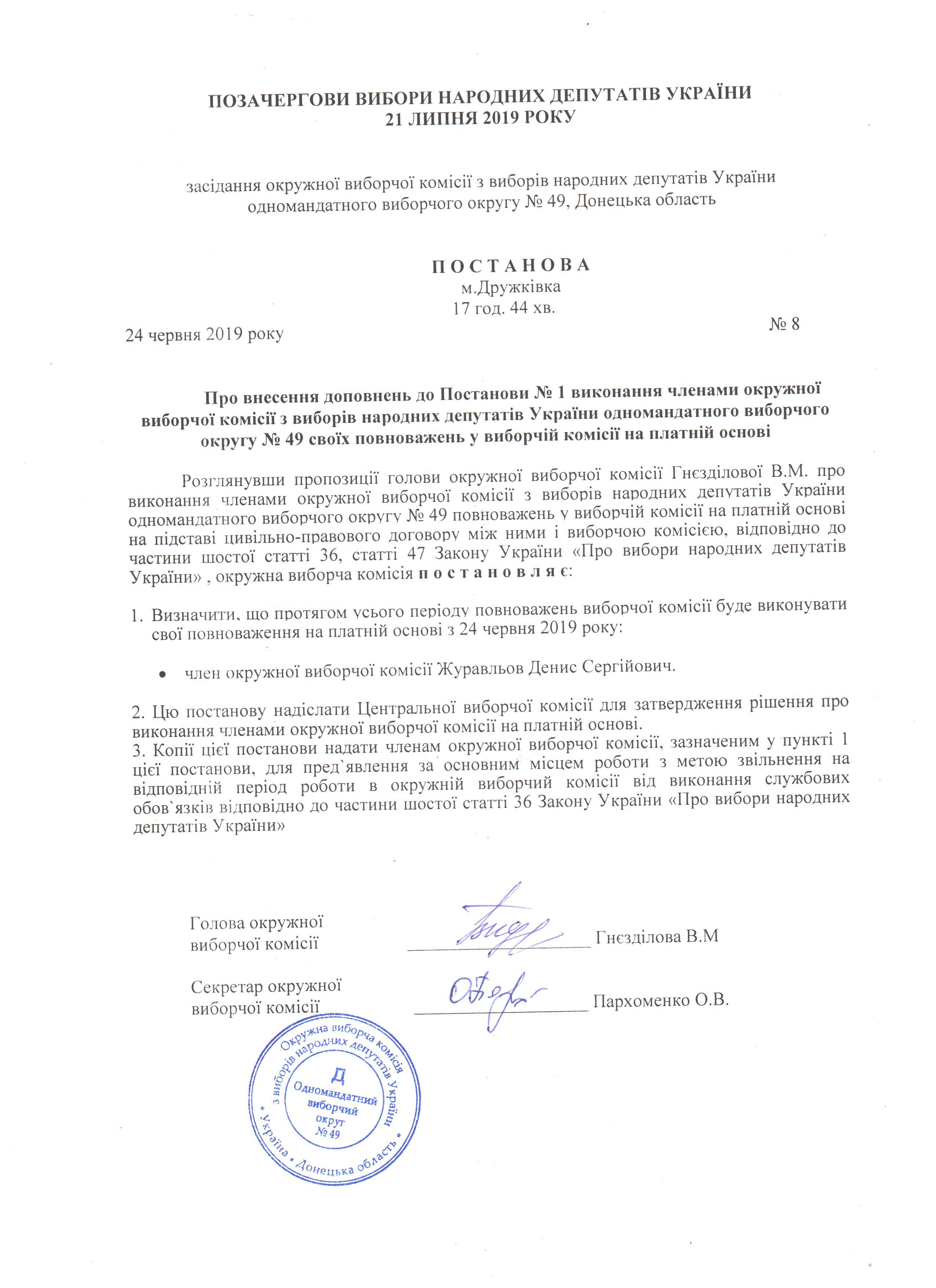 Про виконання членами ОВК з виборів народних депутатів України ОВО № 49 своїх повноважень у виборчій комісії на платній основі |