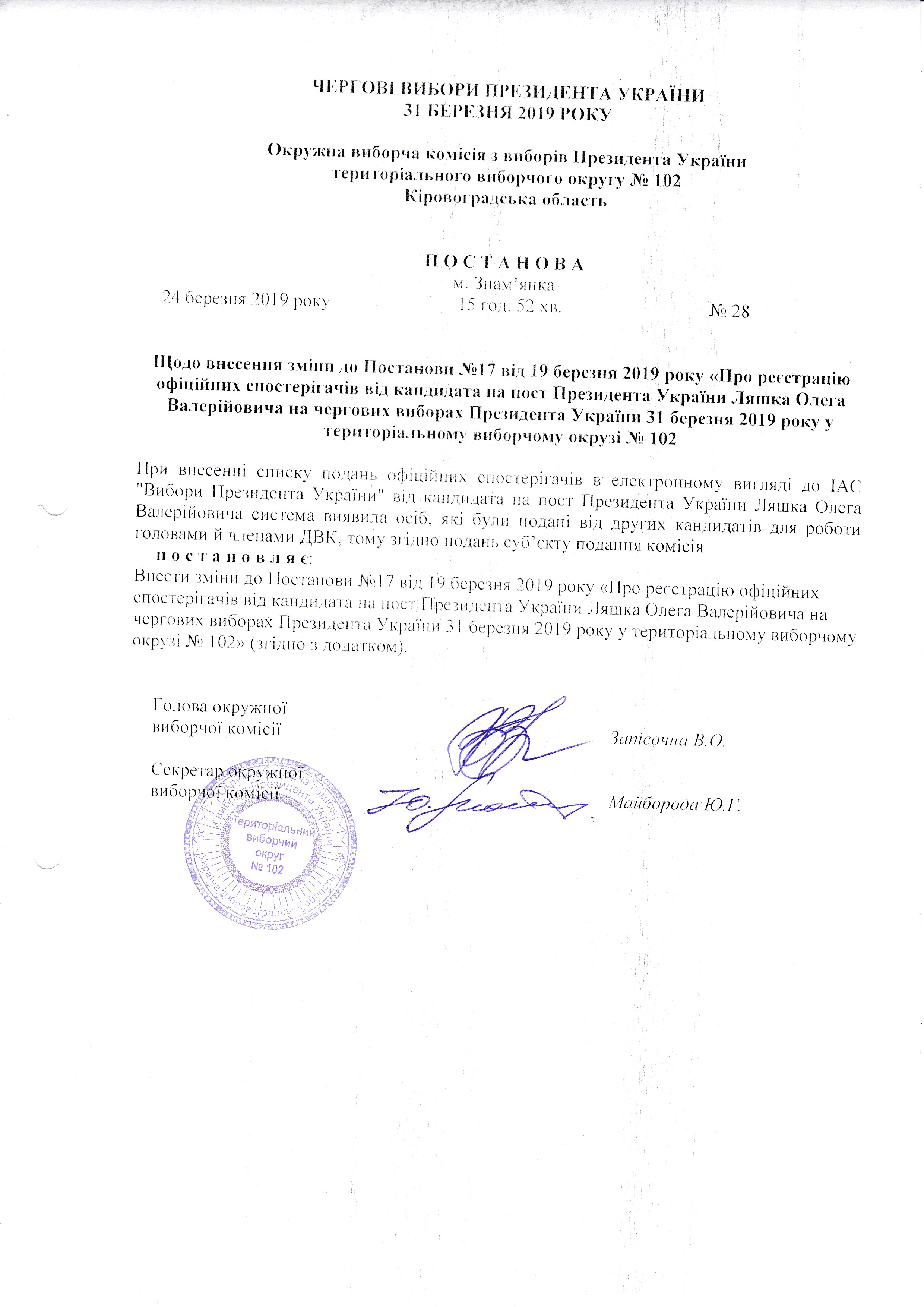 Щодо внесення зміни до Постанови №17 від 19 березня 2019 року "Про реєстрацію офіційних спостерігачів від кандидата на пост Президента України Ляшка Олега Валерійовича на чергових виборах Президента України 31 березня 2019 року у територіальному виборчому округу №102" |
