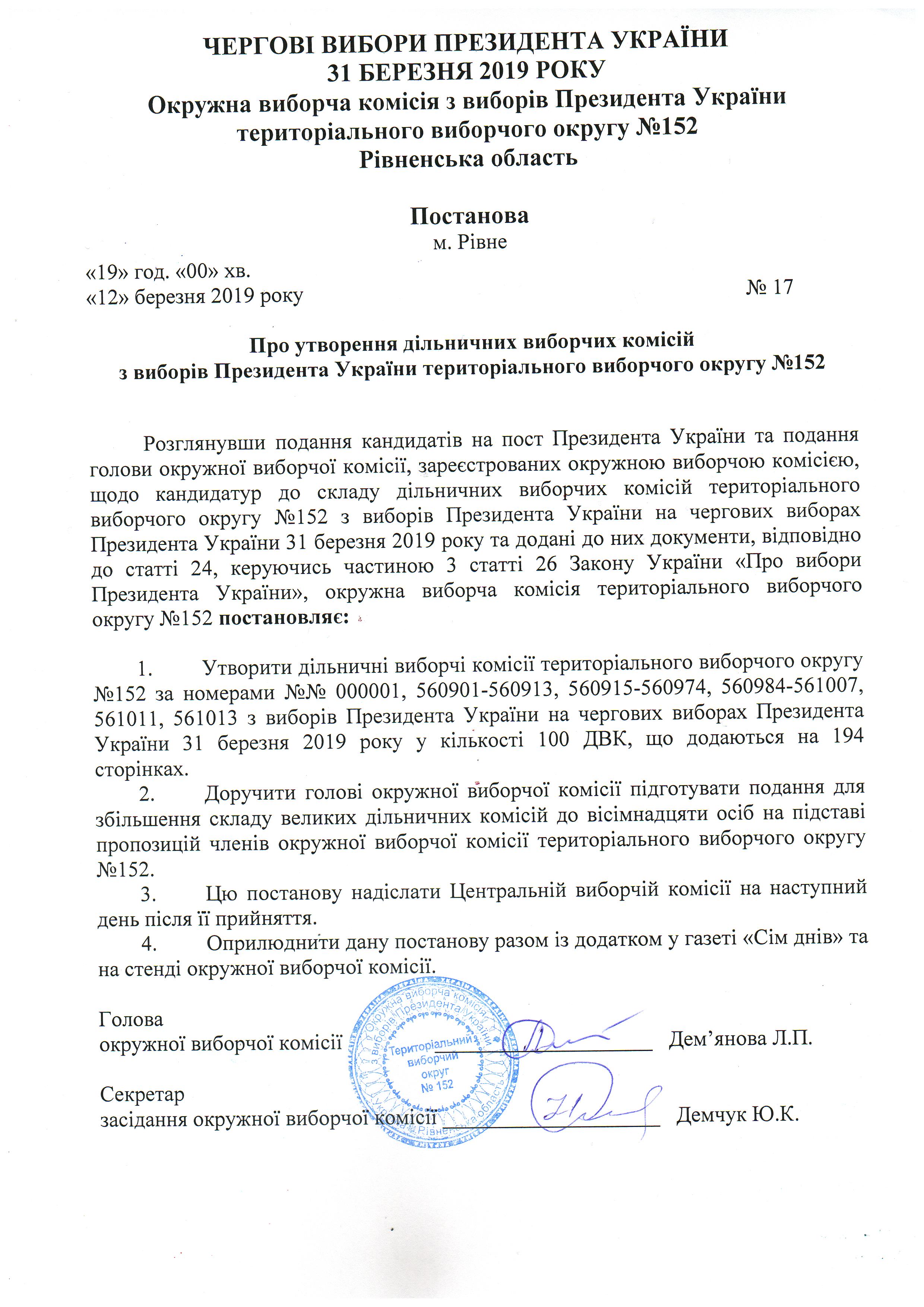 Про утворення дільничних виборчих комісій з виборів Президента України територіального виборчого округу №152 |