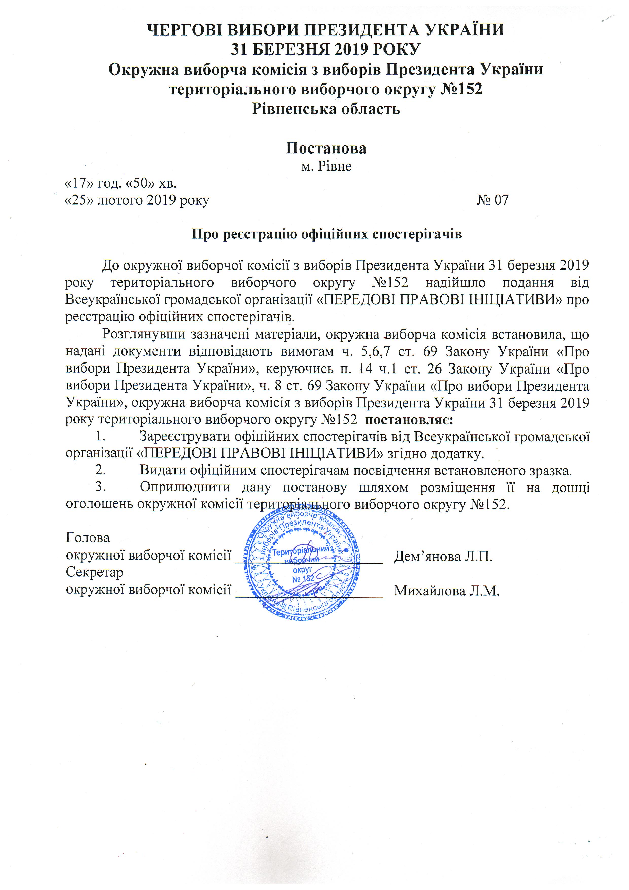 Про внесення змін по постанови №1 ОВК з виборів Президента України ТВО № 152 |