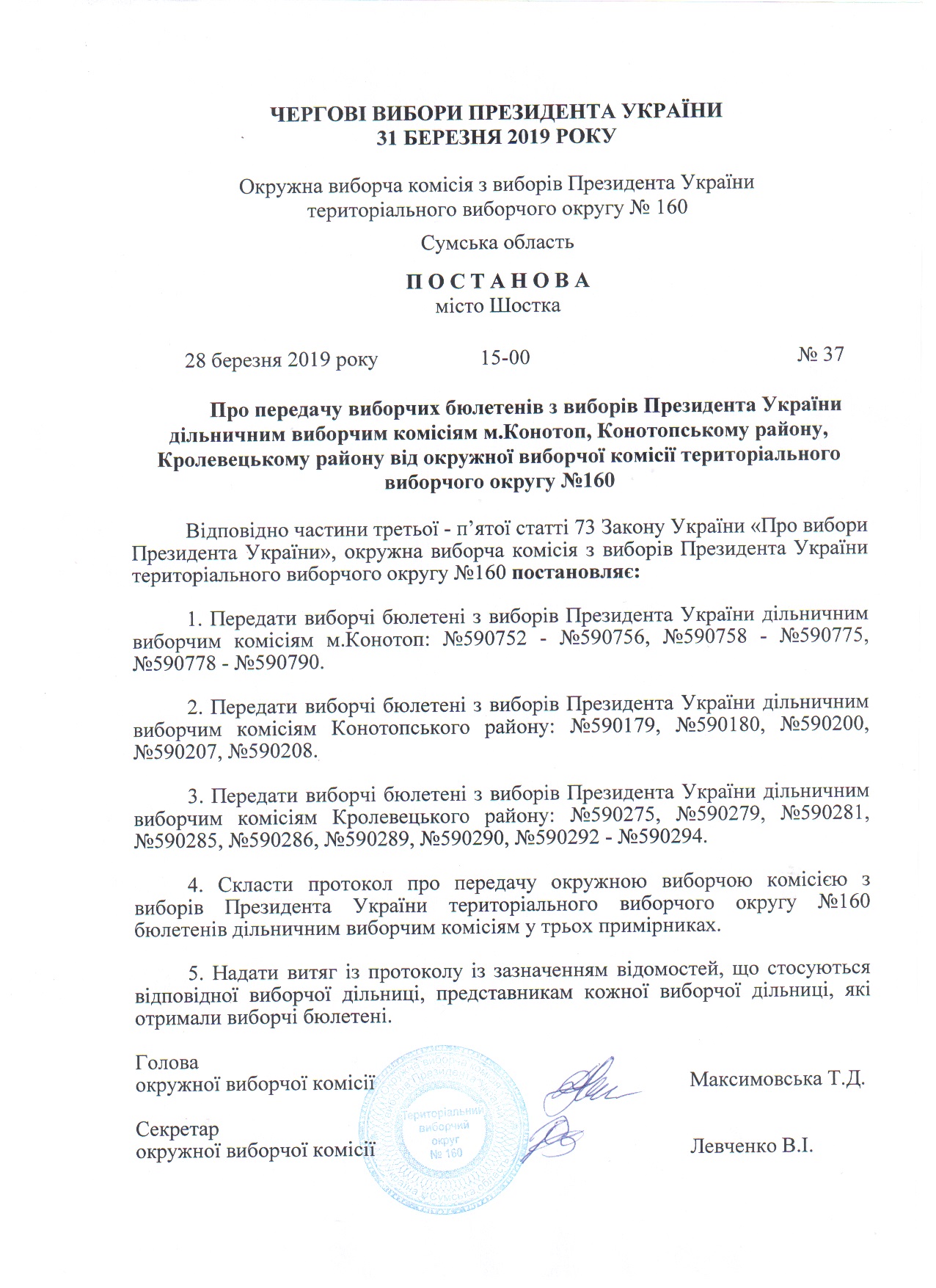 Про передачу виборчих бюлетенів з виборів Перзидента України дільничним виборчим комісіям м.Шостки, Шосткинському району від ОВК ТВО № 160 |