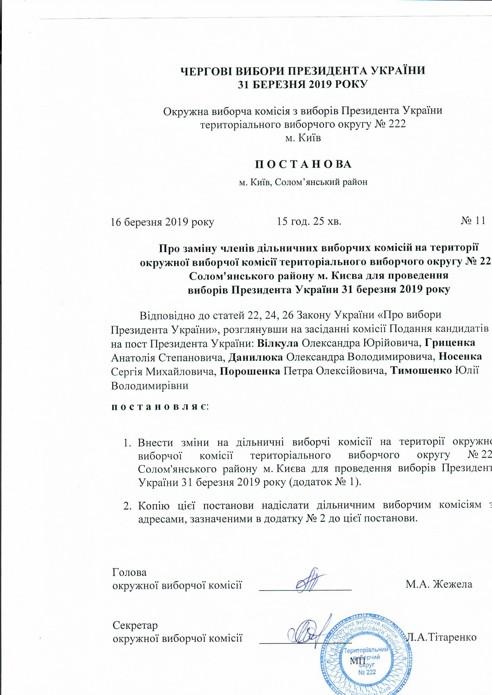 Про зміну членів дільничних виборчих комісій на території окружної виборчої комісії териториального виборчого округу №222 Солом'янського району м. Києва для проведення виборів Президента України 31 березня 2019 року |