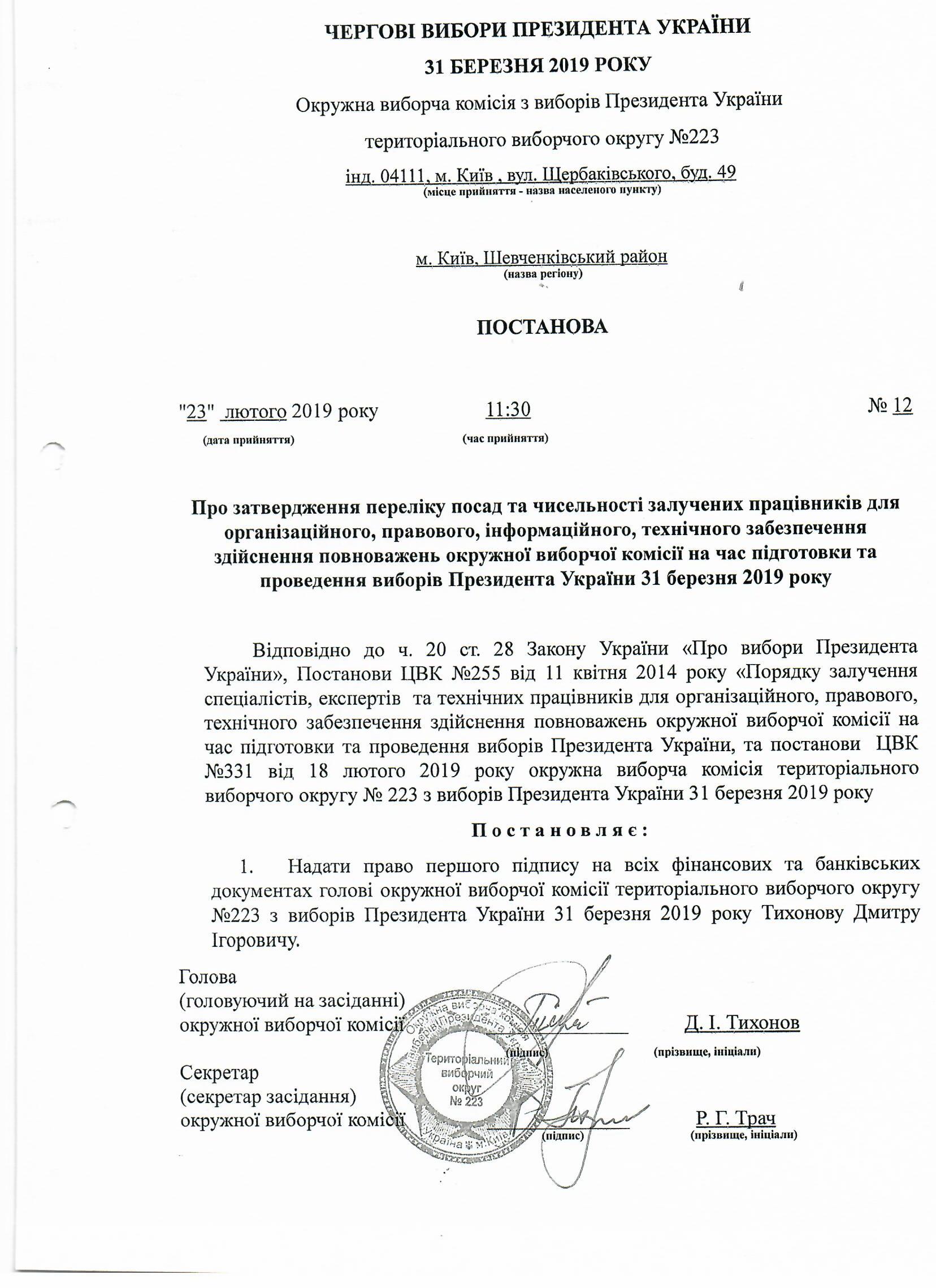 Про надання права першого підпису в бухгалтерських документах голова комісії ОВК ТВО №223 |