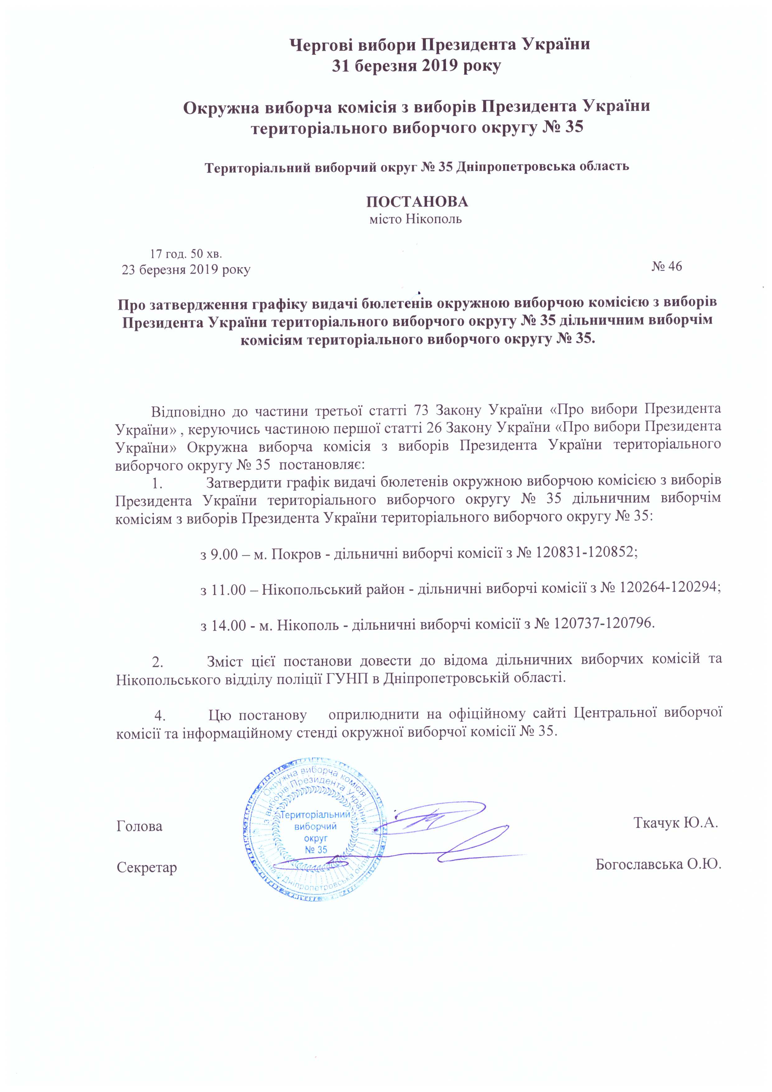 Про уповноваження членів окружної виборчої комісії для транспортування протоколу про підсумки голосування в межах територільного виборчого округу № 35 до Центральної виборчої комісії Украіни |