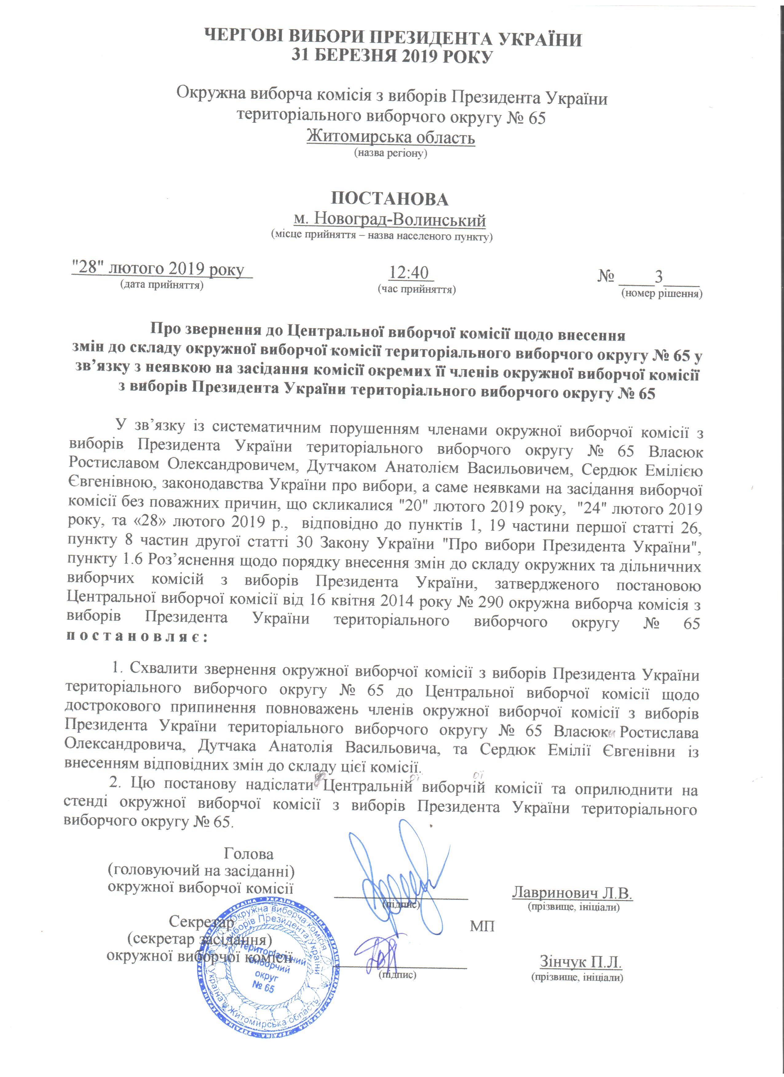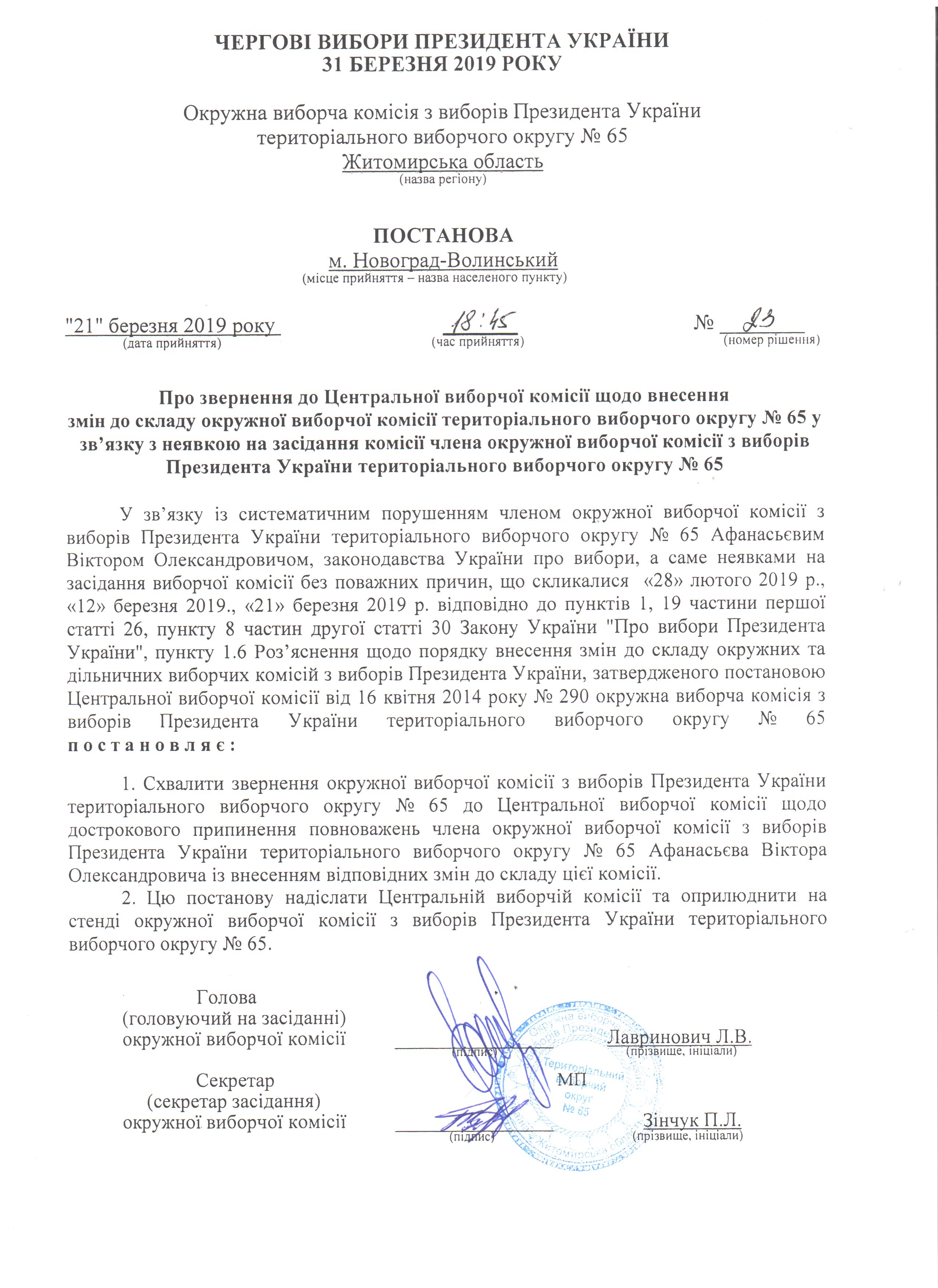 Про звернення до Центральної виборчої комісії щодо внесення змін до складу окружної виборчої комісії територіального виборчого округу № 65 у зв'язку з неявкою на засіданні комісії окремих її членів окружної виборчої комісії з виборів Президента України територіального виборчого округу № 65 |