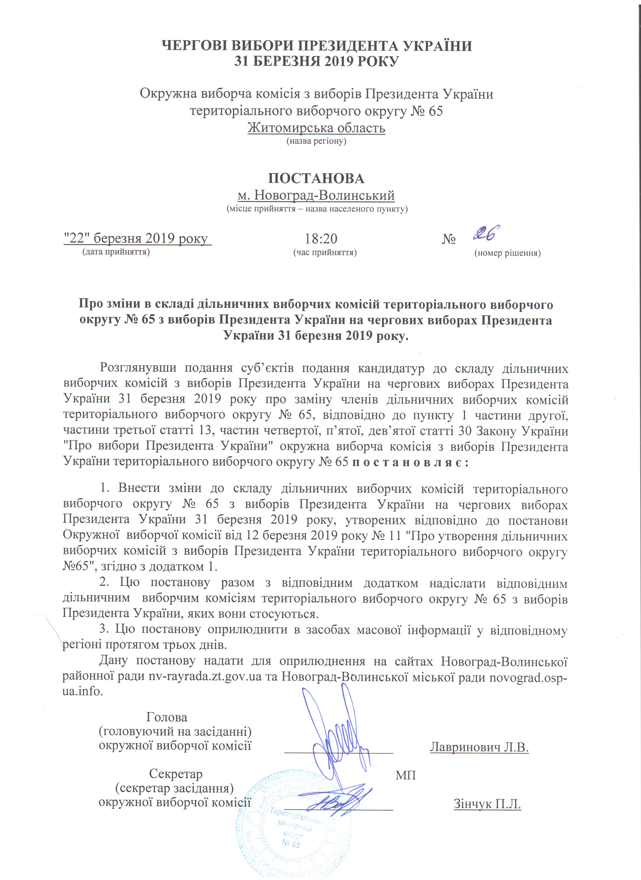 Про зміни в складі дільничних виборчих комісій територіального округу № 65 з виборів Президента України на чергових виборах Президента України 31 березня 2019 року |