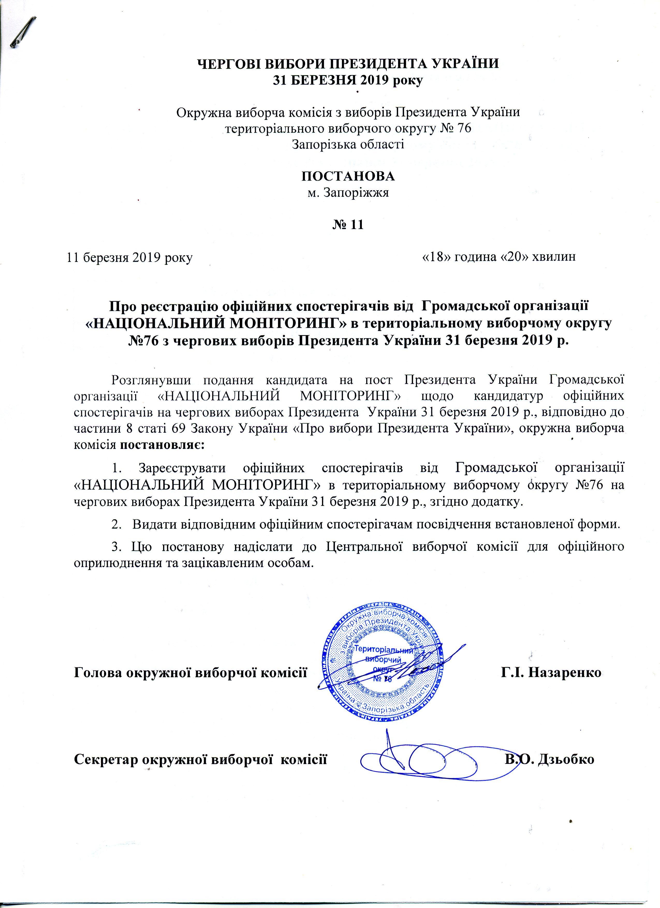 Про реєстрацію офіційних спостерігачів від Громадської організації "НАЦІОНАЛЬНИЙ МОНІТОРИНГ" в територіальному виборчому округу №76 з чергових виборів Президента України 31 березня 2019 р. |