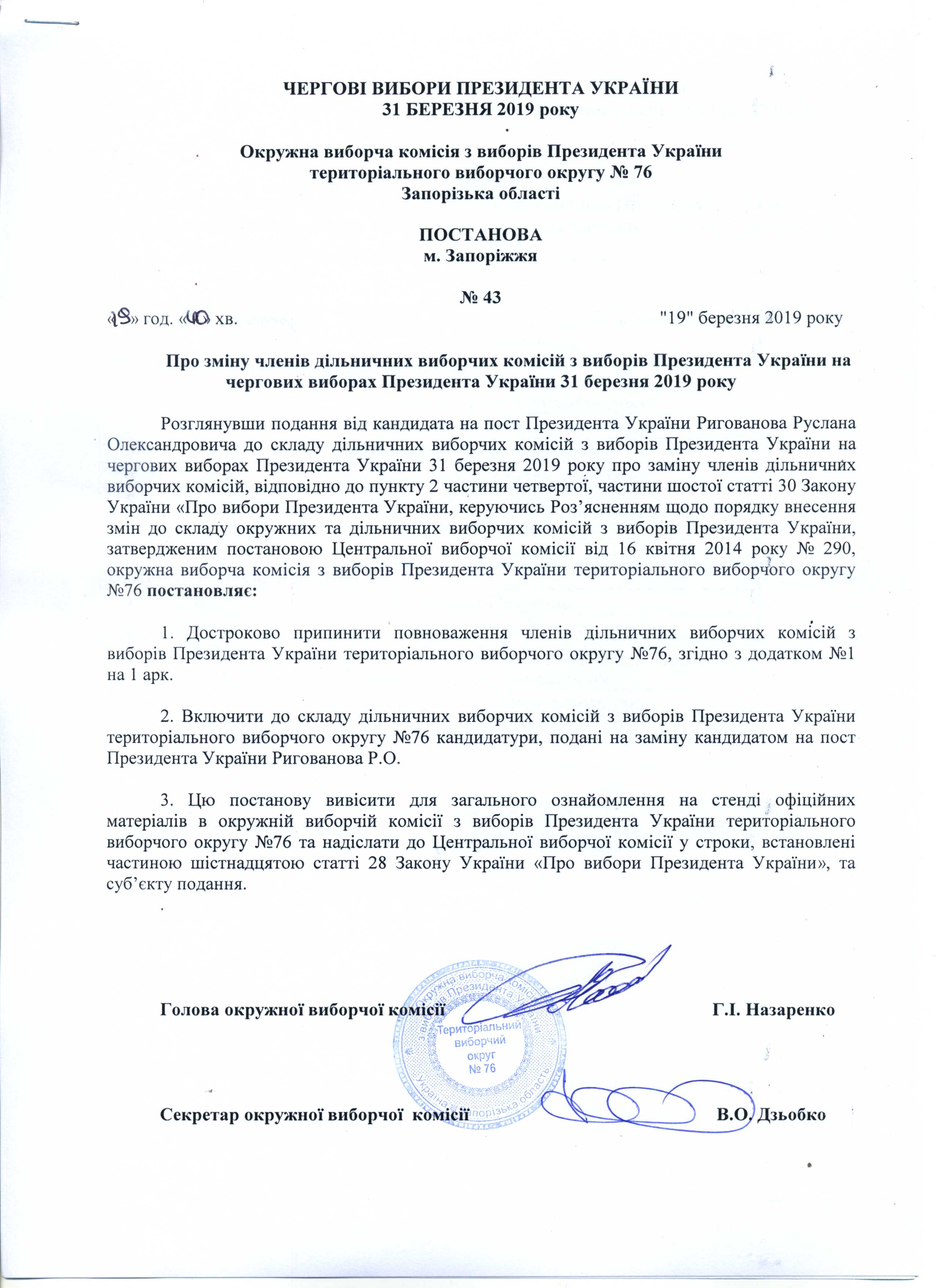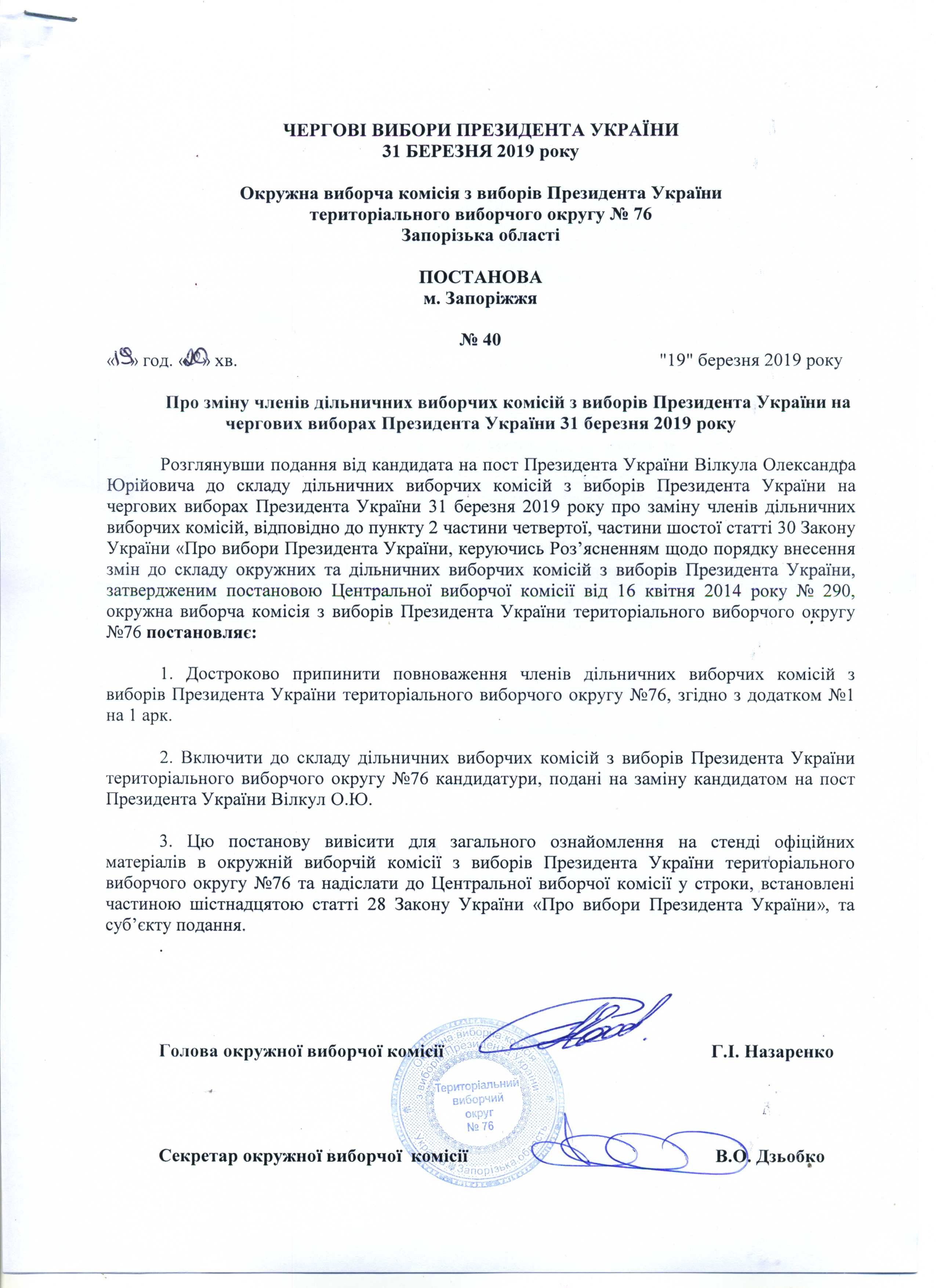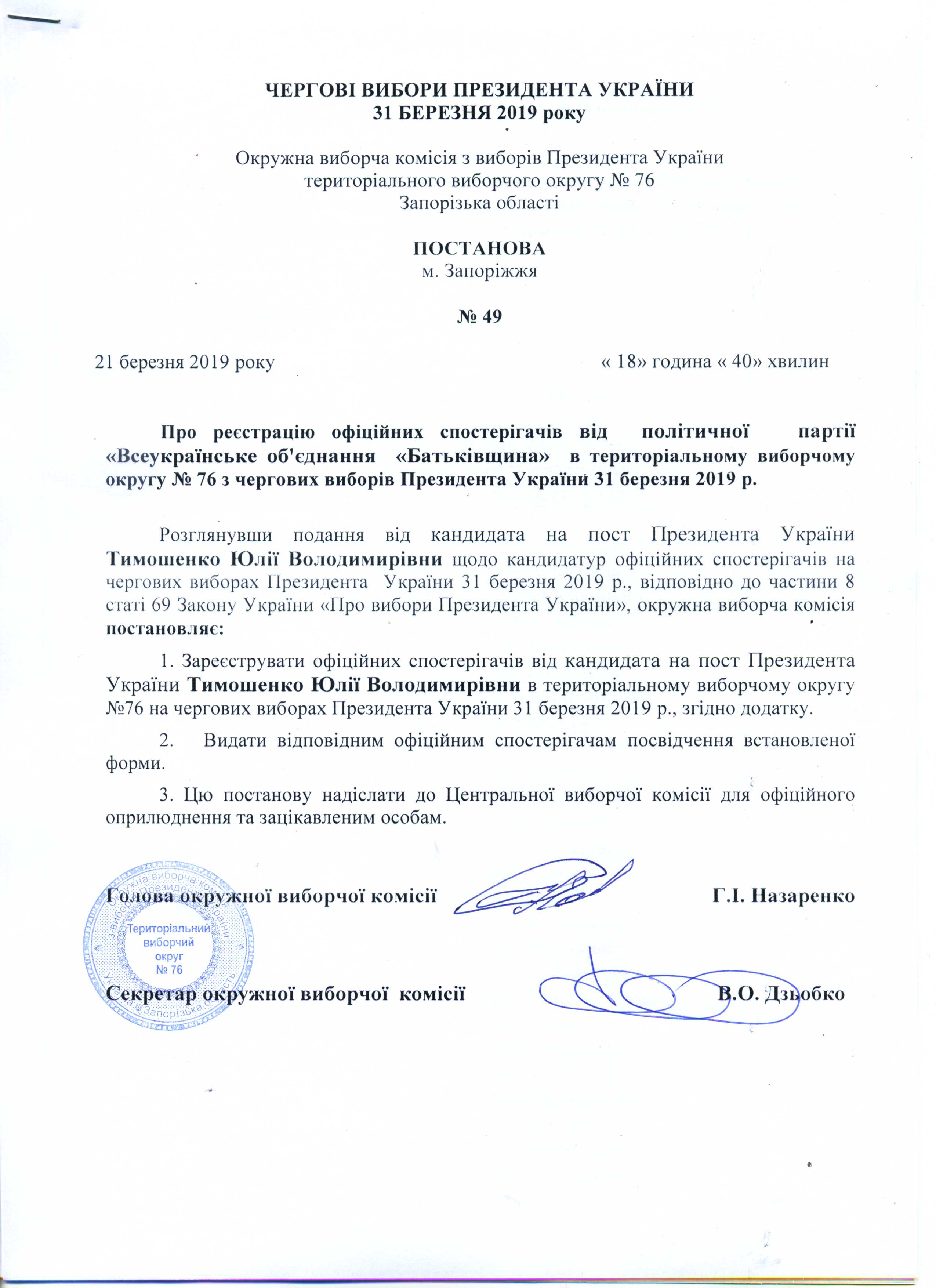 Про реєстрацію офіційних спостерігачів від кандидата на пост Президента України Тимошенко Юлії Володимирівни в територіальному виборчому округу №76 з чергових виборів Президента України 31 березня 2019 року |