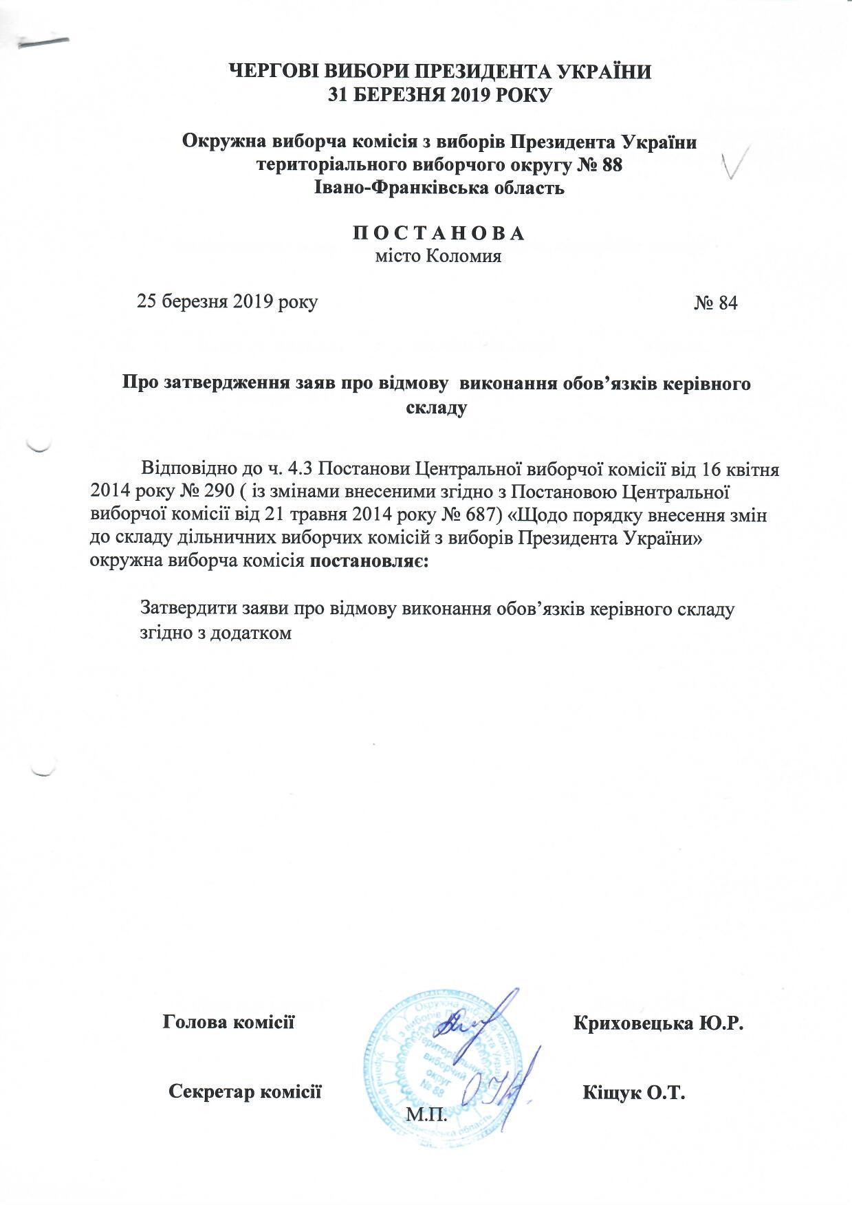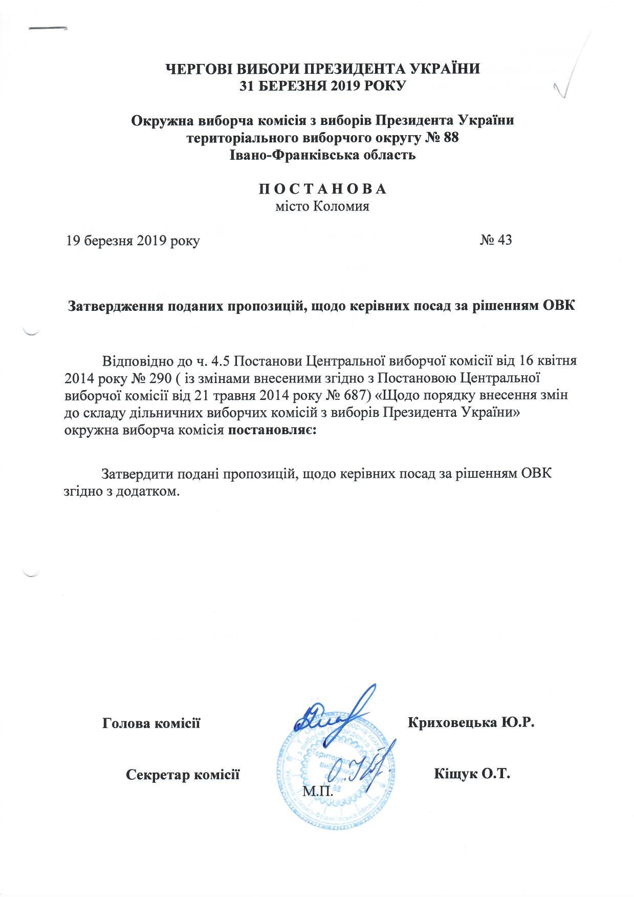 Про внесення змін до постанови № 21 від 12 березня 2019 року «Про формування ДВК» дільничної виборчої комісії № 88 |