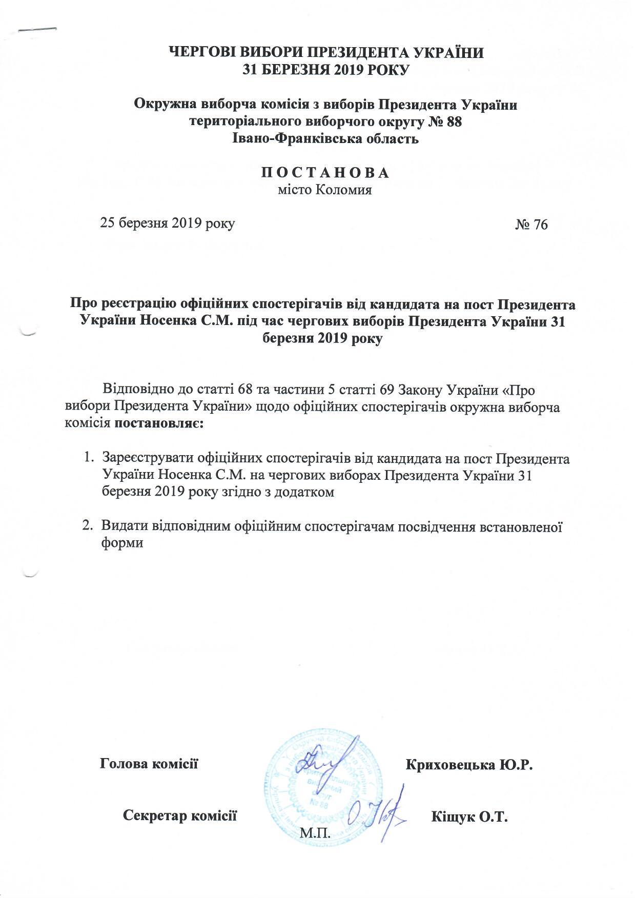 Про реєстрацію офіційних спостерігачів від кандидата на пост Президента України Носенка С.М. під час чергових виборів Президента України 31 березня 2019 року |
