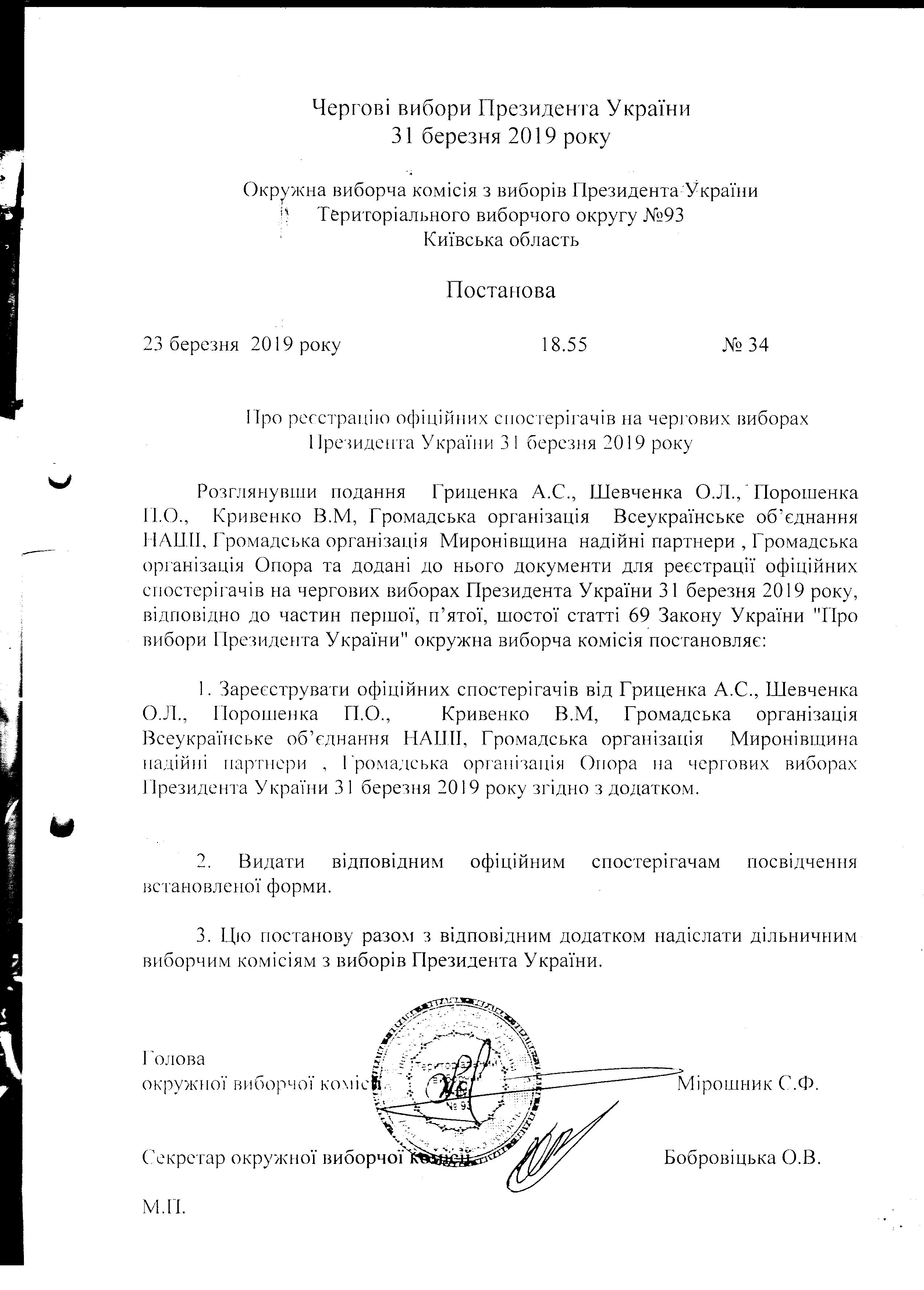 Про реєстрацію офіційних спостерігачів від Всеукраїнської громадської організації "Громадська мережа "ОПОРА" ОВК виборчого округу № 93 |