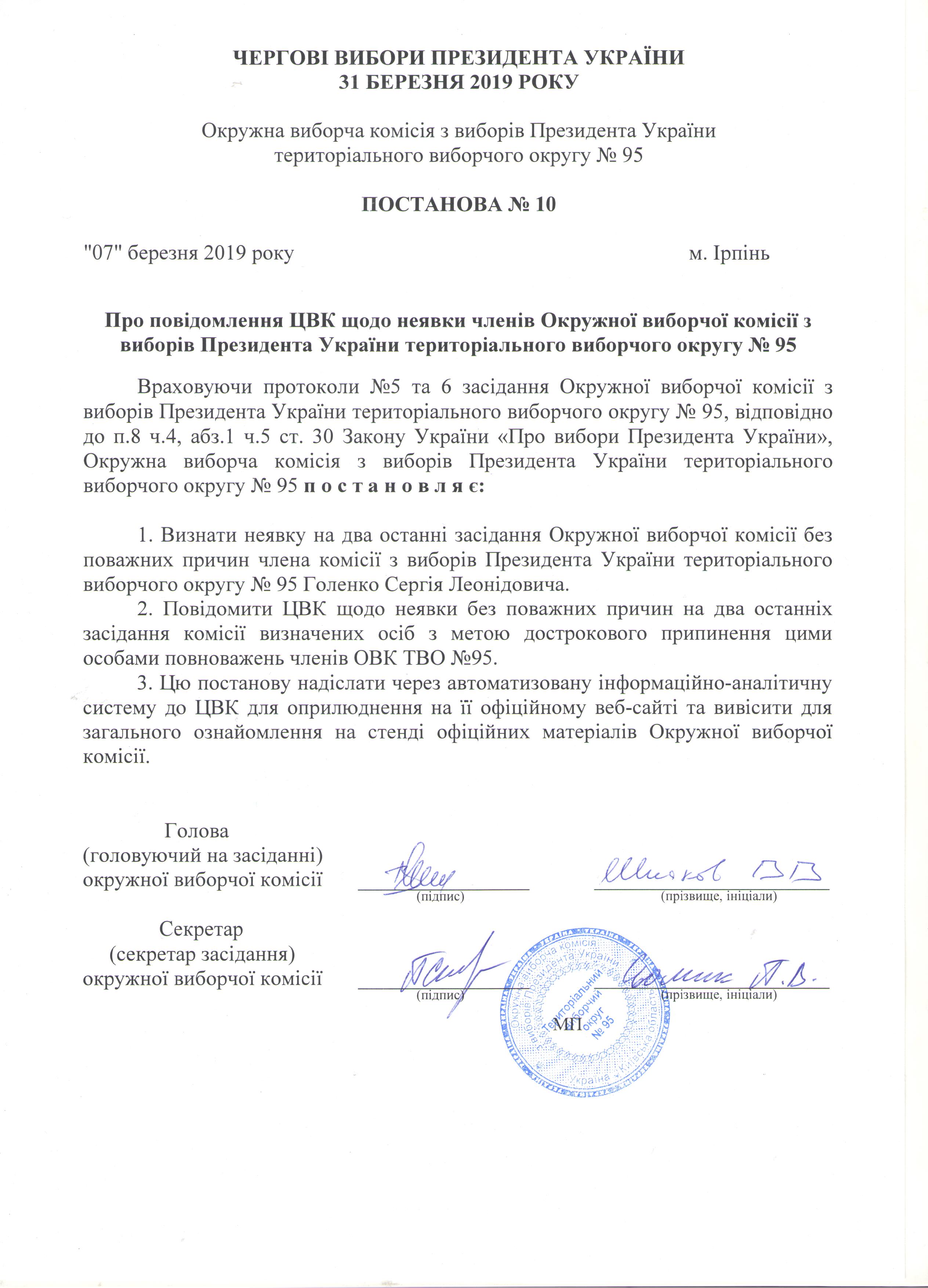 Про повідомлення ЦВК щодо неявки членів Окружної виборчої комісії з виборів Презилента України територівльного виборчого округу №95 на засіданні комісії |
