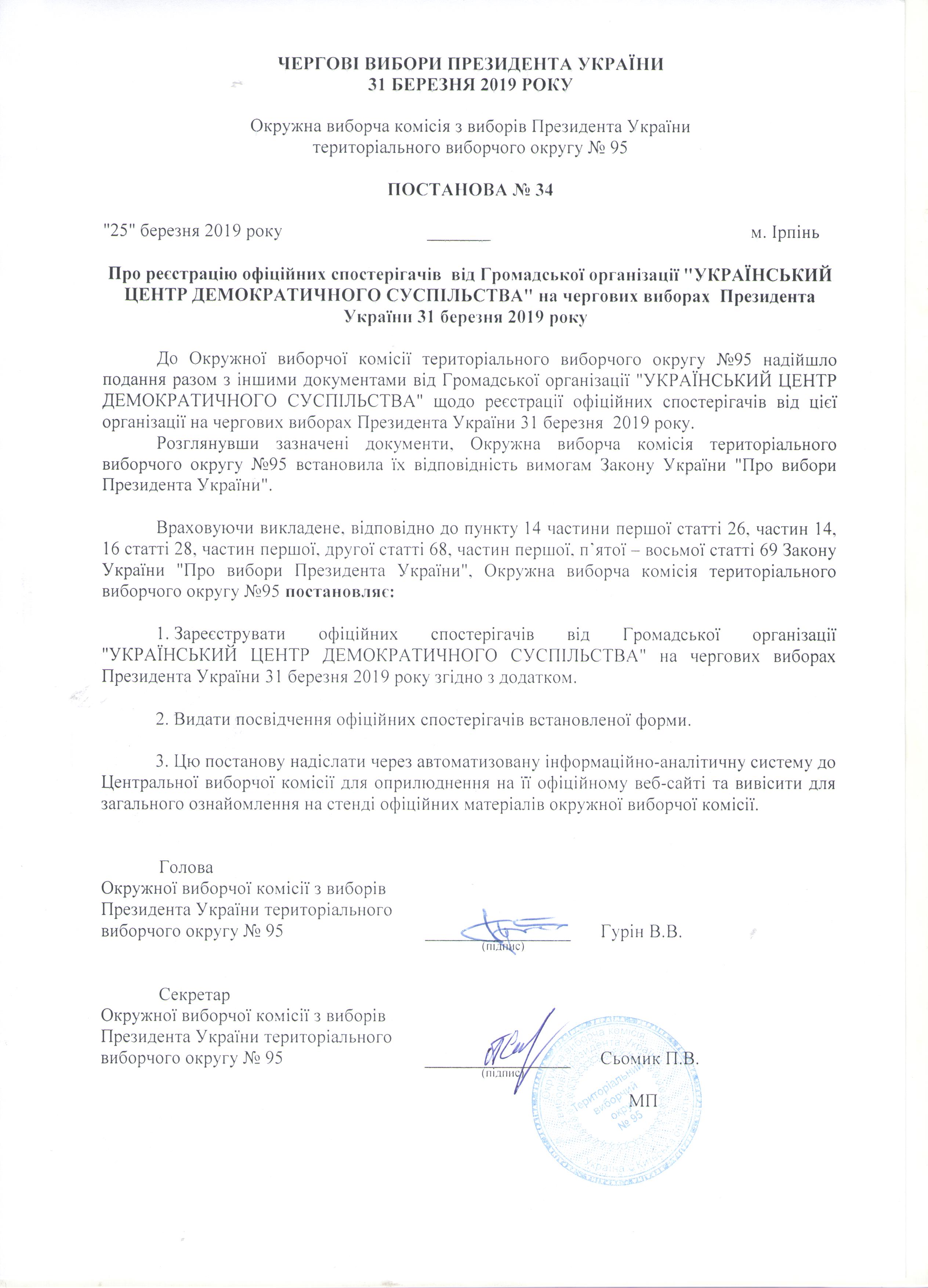 Про реєстрацію офіційних спостерігачів від Громадської організації "УКРАЇНСЬКИЙ ЦЕНТР ДЕМОКРАТИЧНОГО СУСПІЛЬСТВА" на чергових виборах Президента України 31 березня 2019 року |