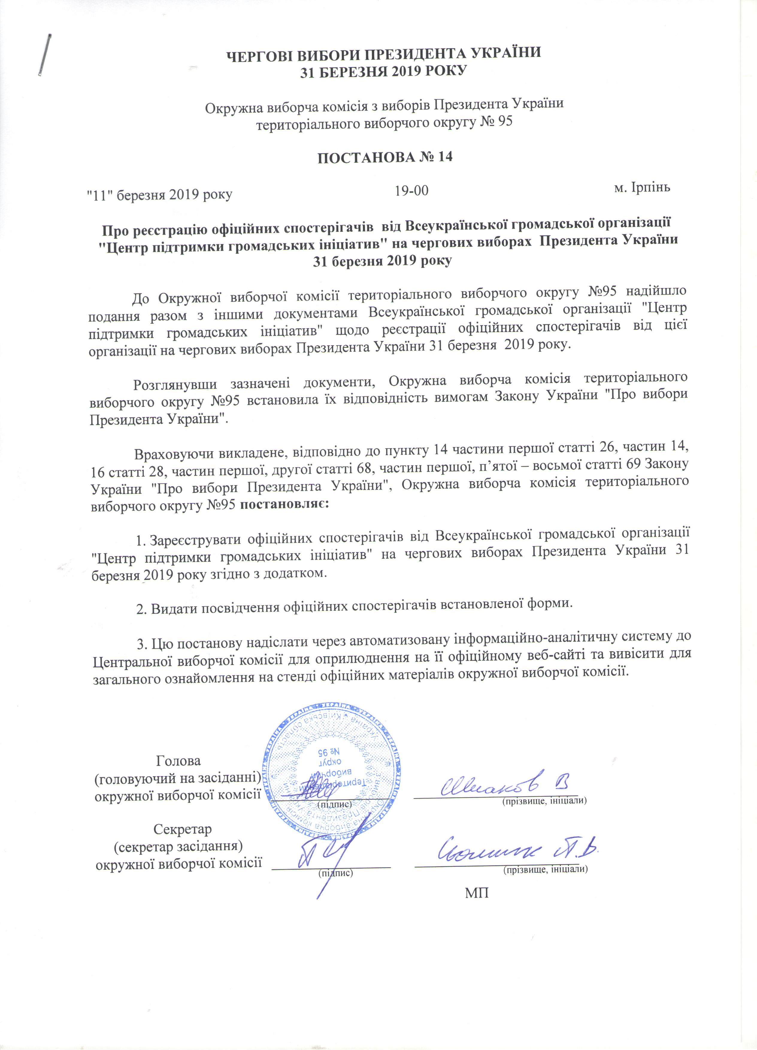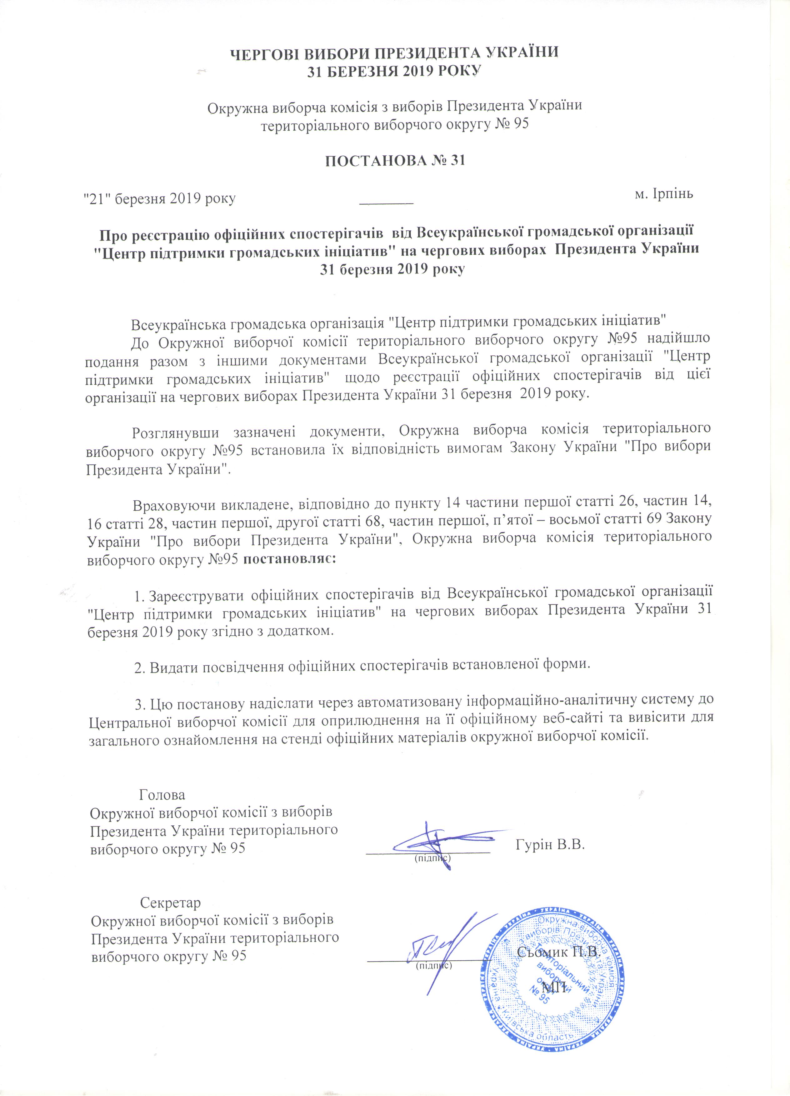 Про реєстрацію офіційних спостерігачів від Всеукраїнської громадської організації "Центр підтримки громадських ініціатив" на чергових виборах Президента України 31 березня 2019 рок |