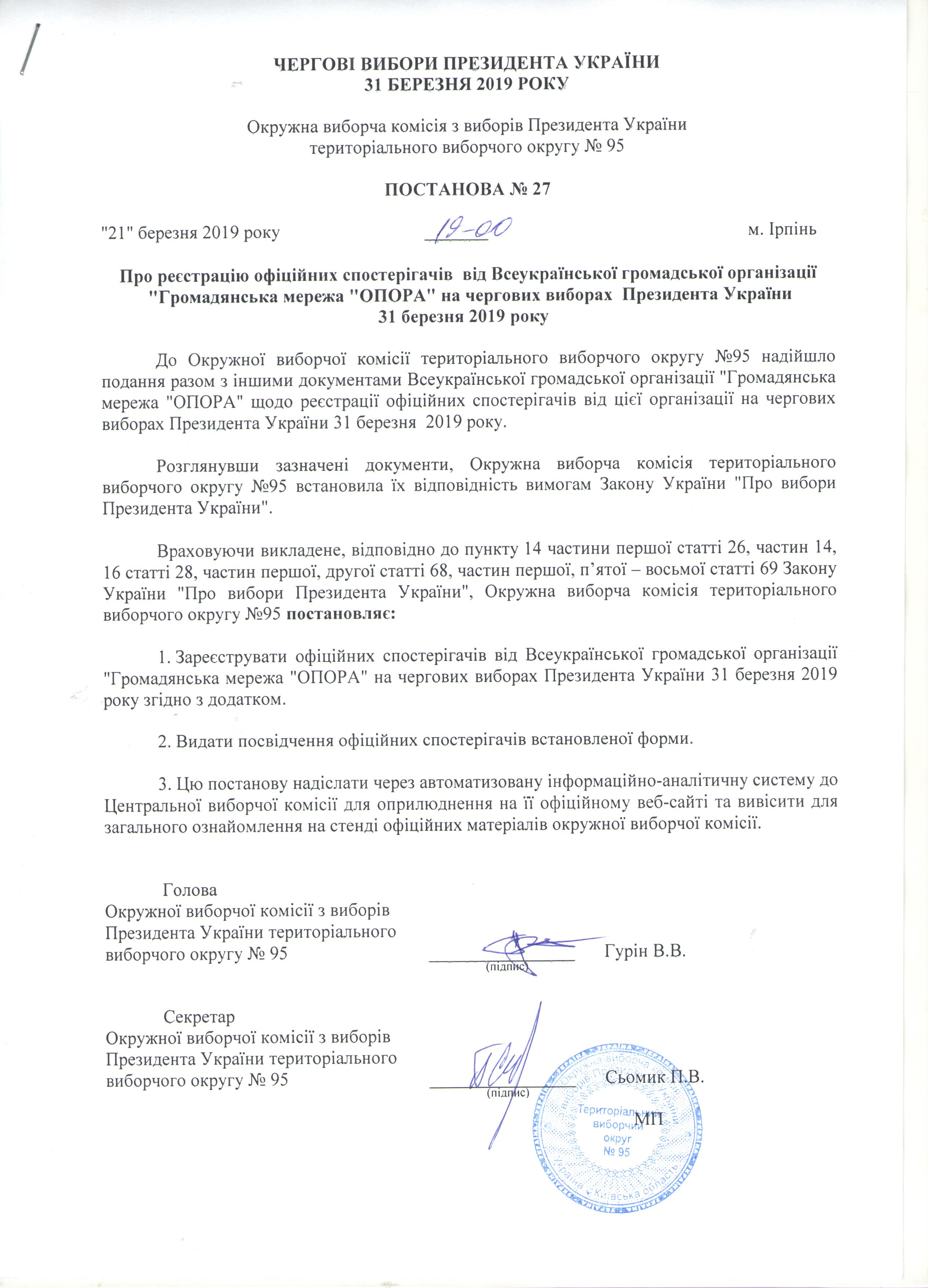 Про реєстрацію офіційних спостерігачів від Всеукраїнської громадської організації "Громадянська мережа "ОПОРА" " на чергових виборах Президента України 31 березня 2019 рок |