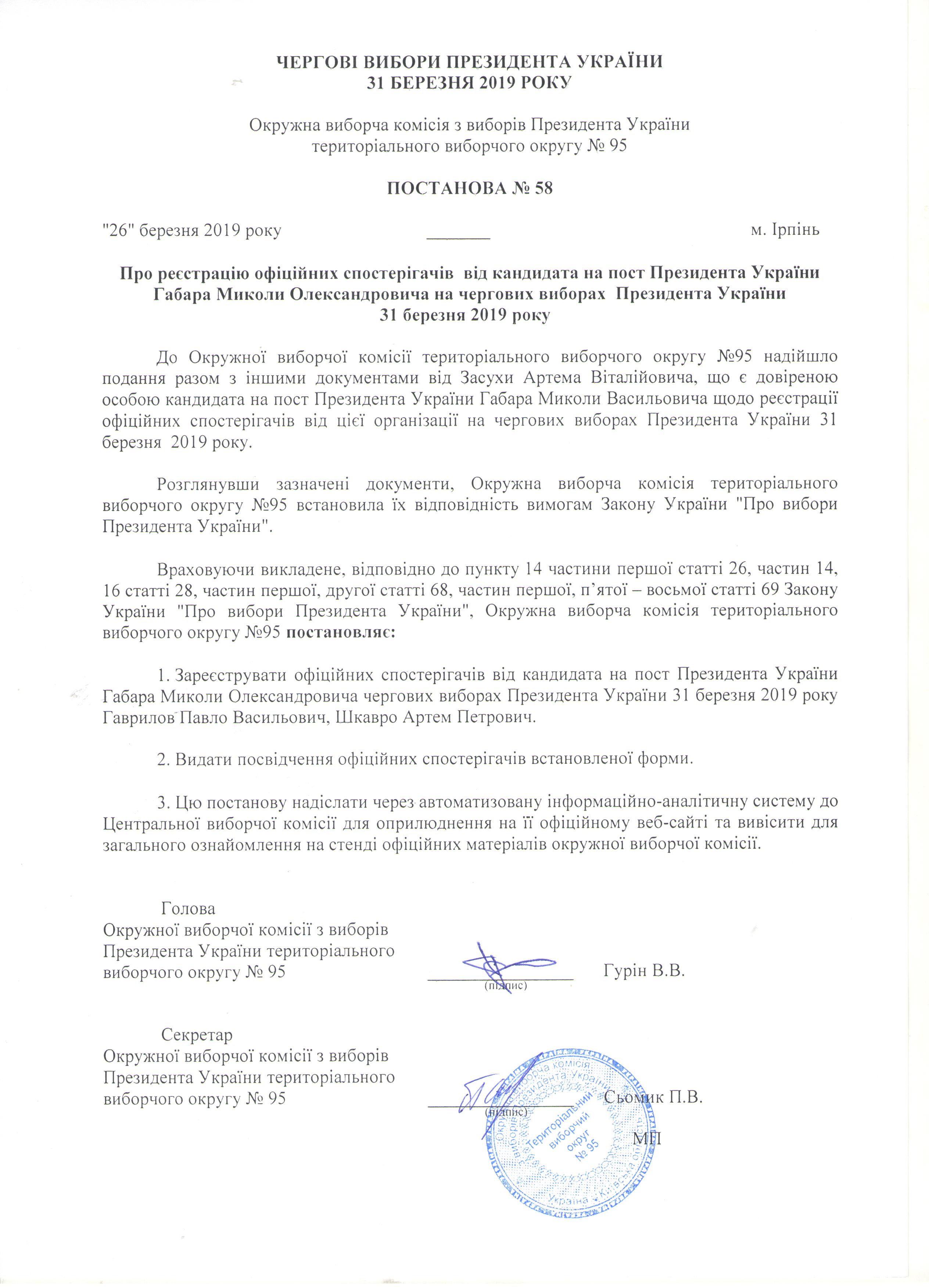 Про реєстрацію офіційних спостерігачів від кандидата на пост Президента України Габера Миколи Олександровича на чергових виборах Президента України 31 березня 2019 року |