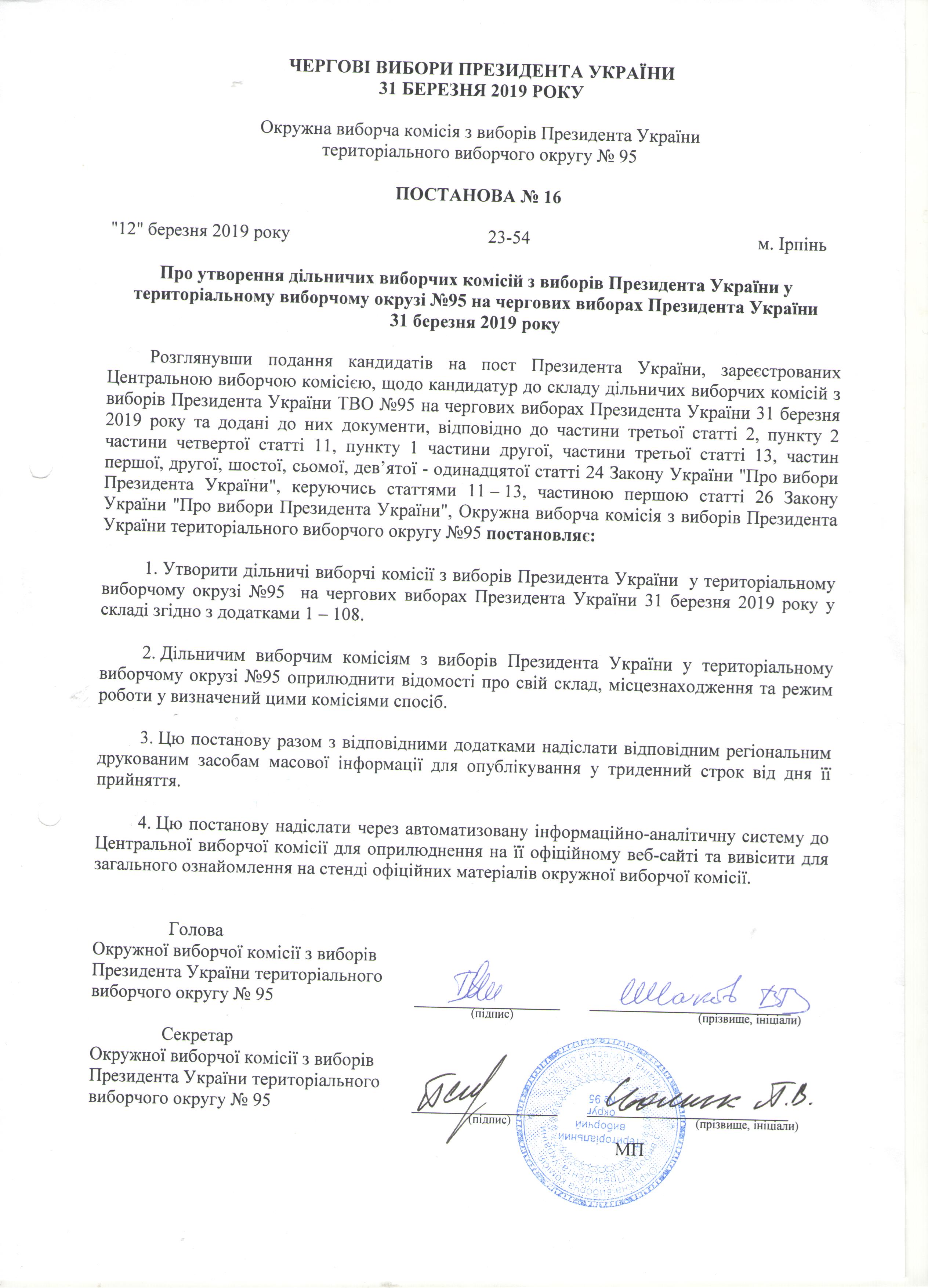 Про утворення дільничих виборчих комісій з виборів Президента України у територіальному виборчому окрузі №95 на чергових виборах Президента України 31 березня 2019 |