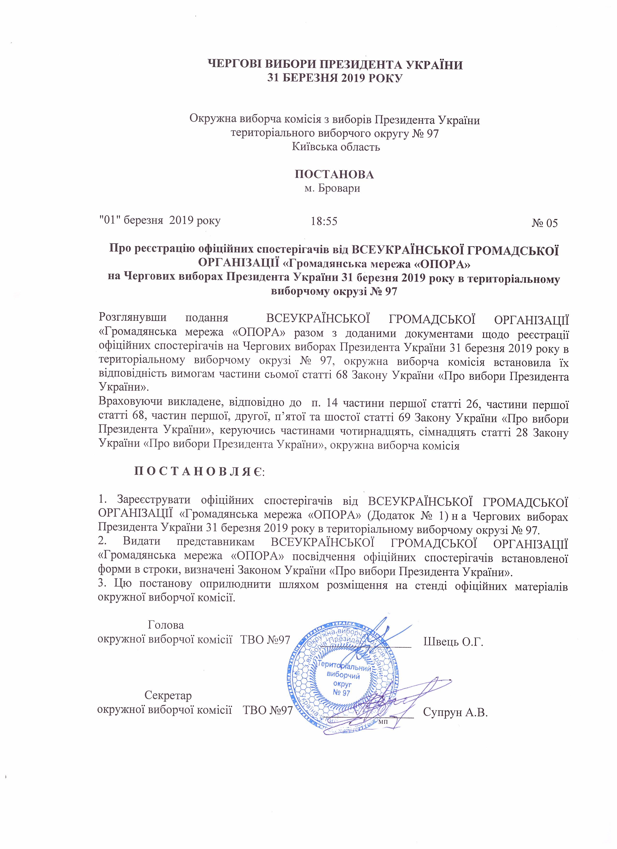 Про реєстрацію офіційних спостерігачів від Громадської організації « Рада з екологічної безпеки» на Чергових виборах Президента України 31 березня 2019 року в територіальному виборчому окрузі № 97 |