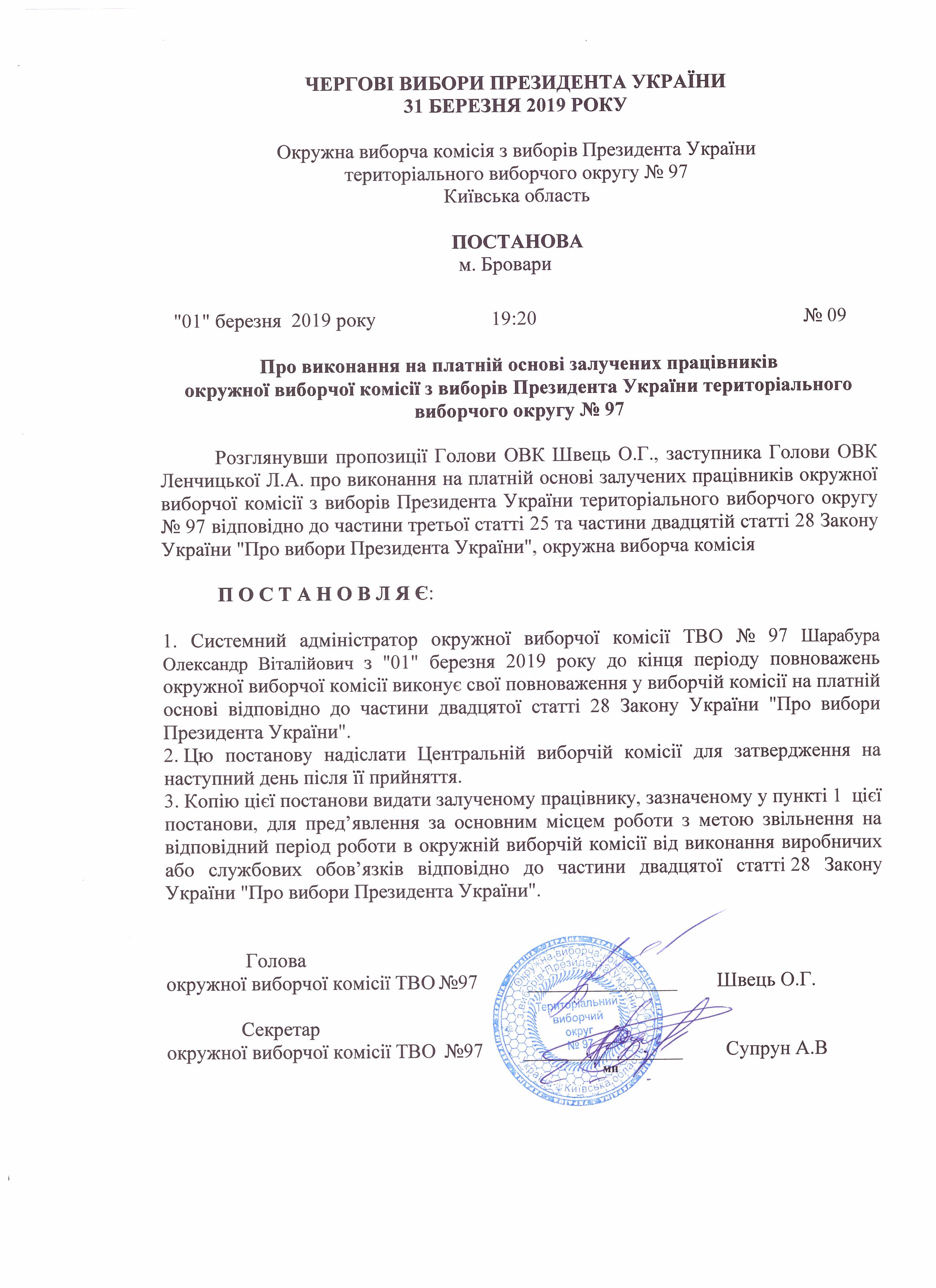 Про виконання на платній основі залучених працівників ОВК з виборів Президента України ТВО № 97 |