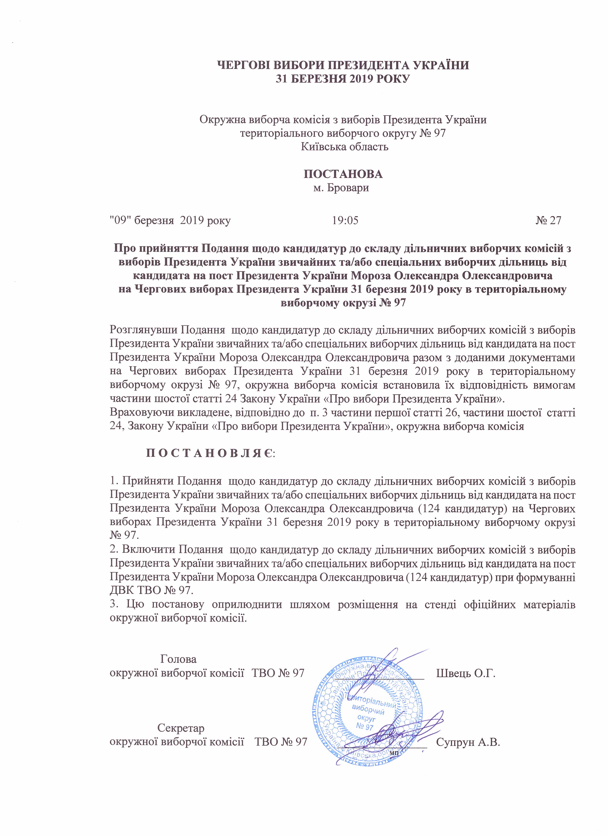 Про визначення відповідальної особи за організацію використання кваліфікованих електронних довірчих послуг на чергових виборах Президента України 31 березня 2019 року в ТВО № 97 |