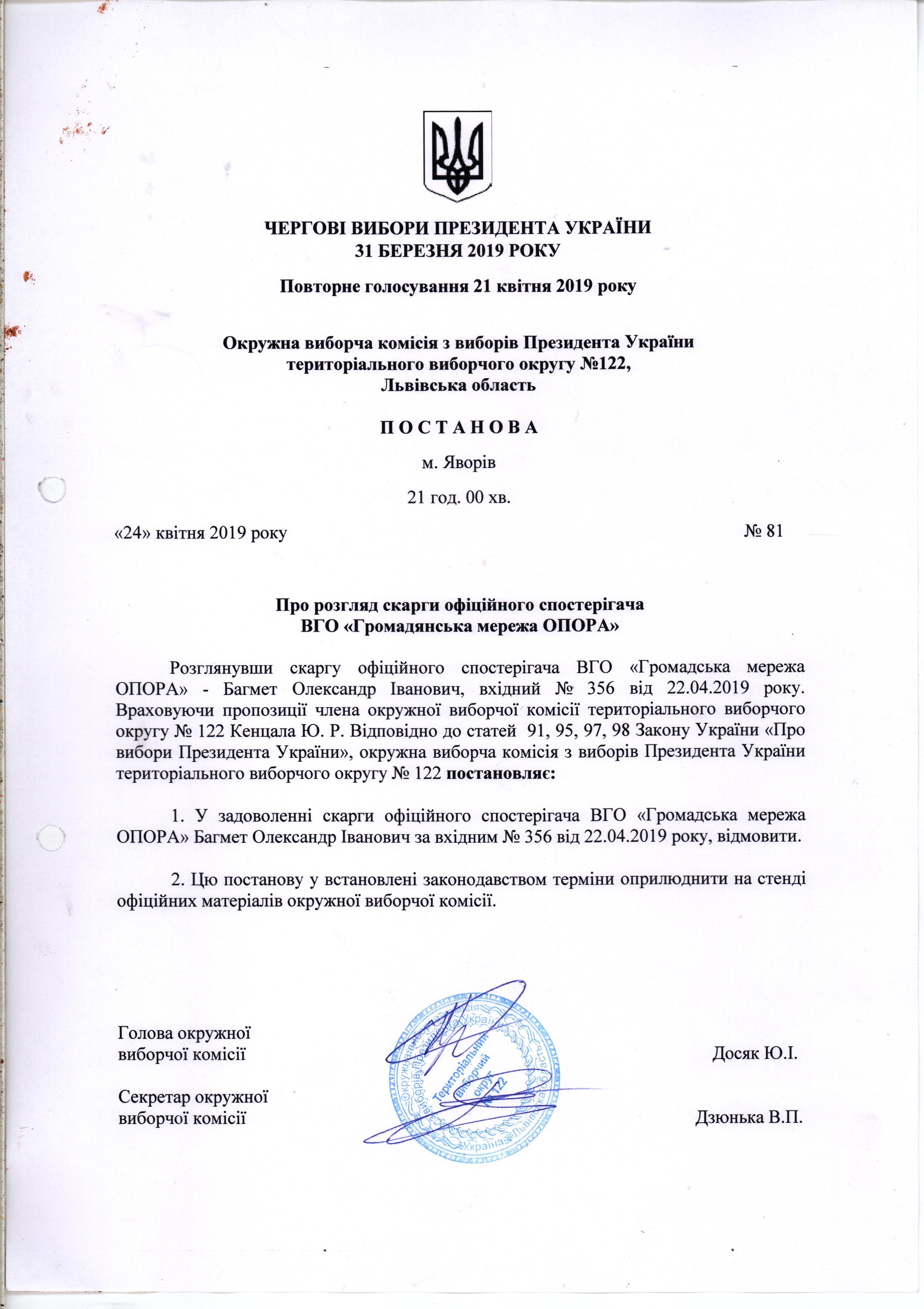 Про розгляд скарги офіційного спостерігача ВГО "Громадянська мережа ОПОРА" |