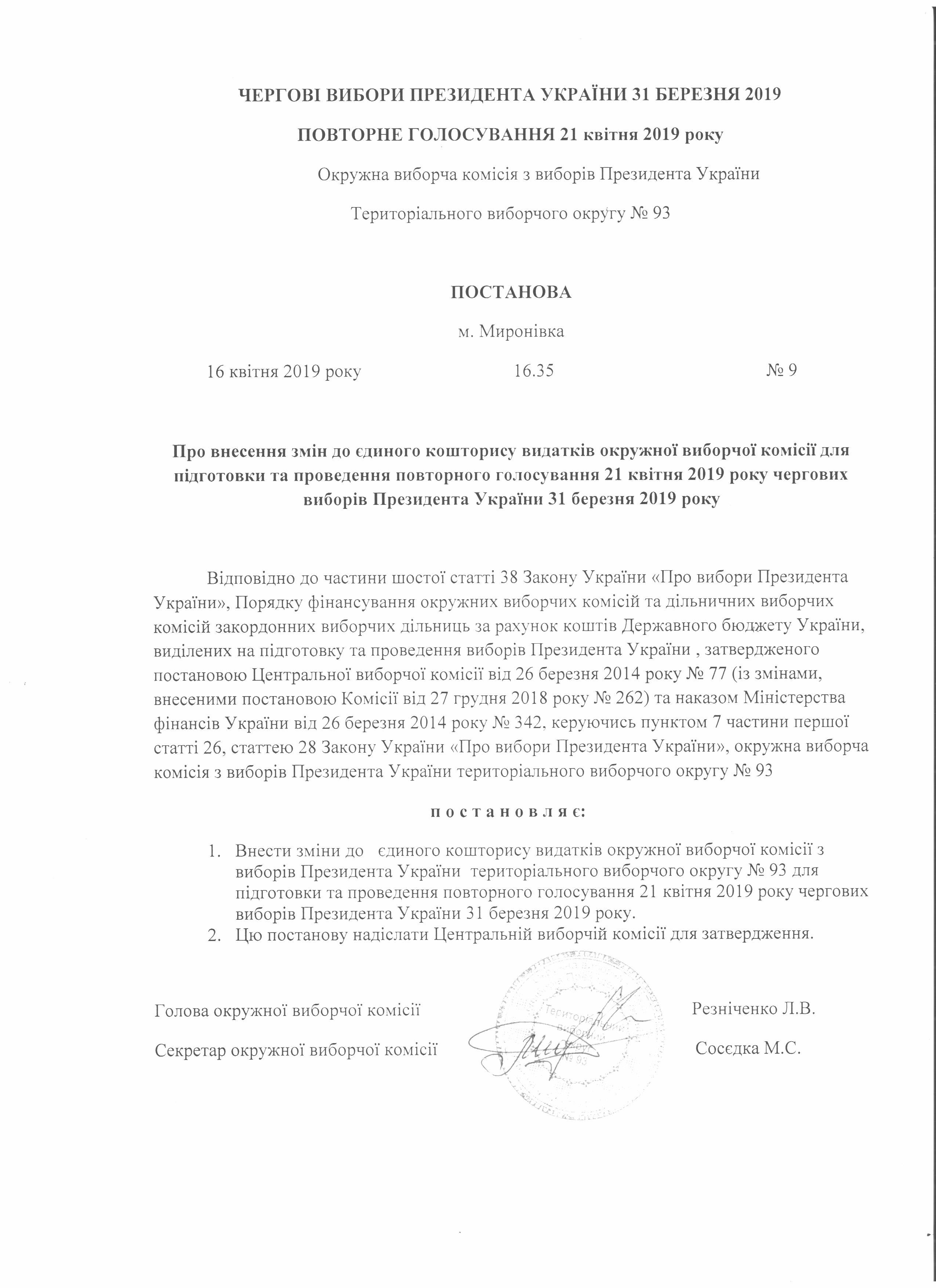 Про виконання членами ОВК з виборів Президента України ТВО № 93 своїх повноважень на платній основі |