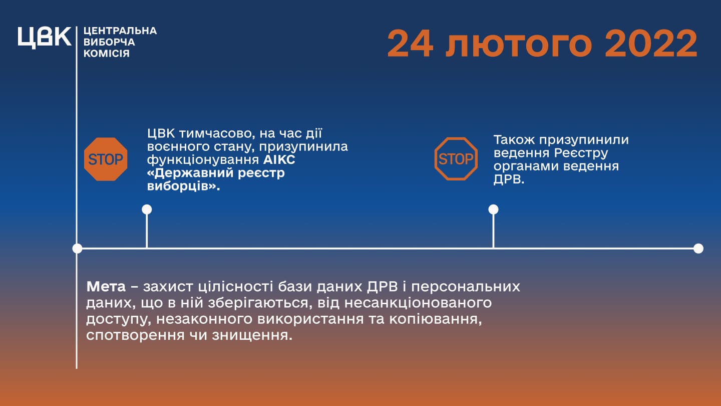 Також нині відновив роботу електронний кабінет виборця, де громадяни можуть онлайн перевірити свої дані та оновити у разі потреби: https://www.drv.gov.ua/svc/f?p=111:1