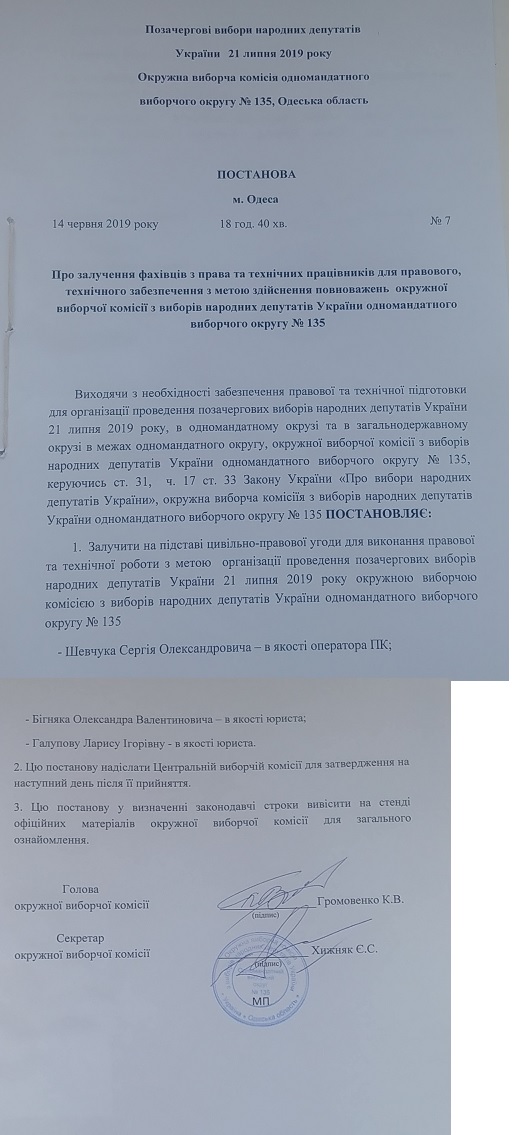 Про залучення фахівців та технічних працівників для організаційного, технічного забезпечення здійснення повноважень окружної виборчої комісії одномандатного виборчого округу №135 на позачергових виборах народних депутатів України 21 липня 2019 року |