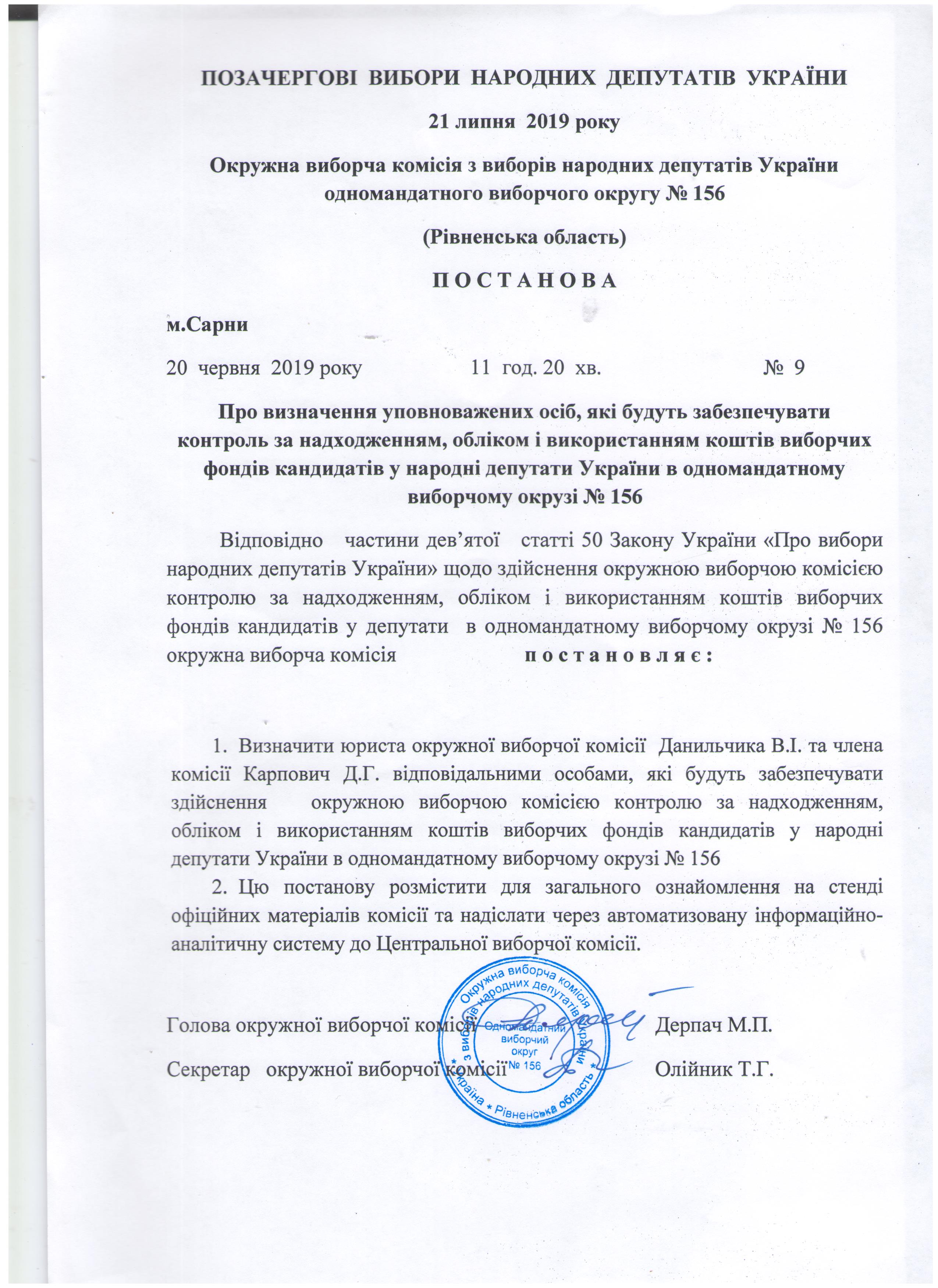 Про надання права підпису фінансових документів окружної виборчої комісії з виборів народних депутатів України одномандатного округу № 156 на час підготовки та проведення позачергових виборів народних депутатів України 21 липня 2019 року |