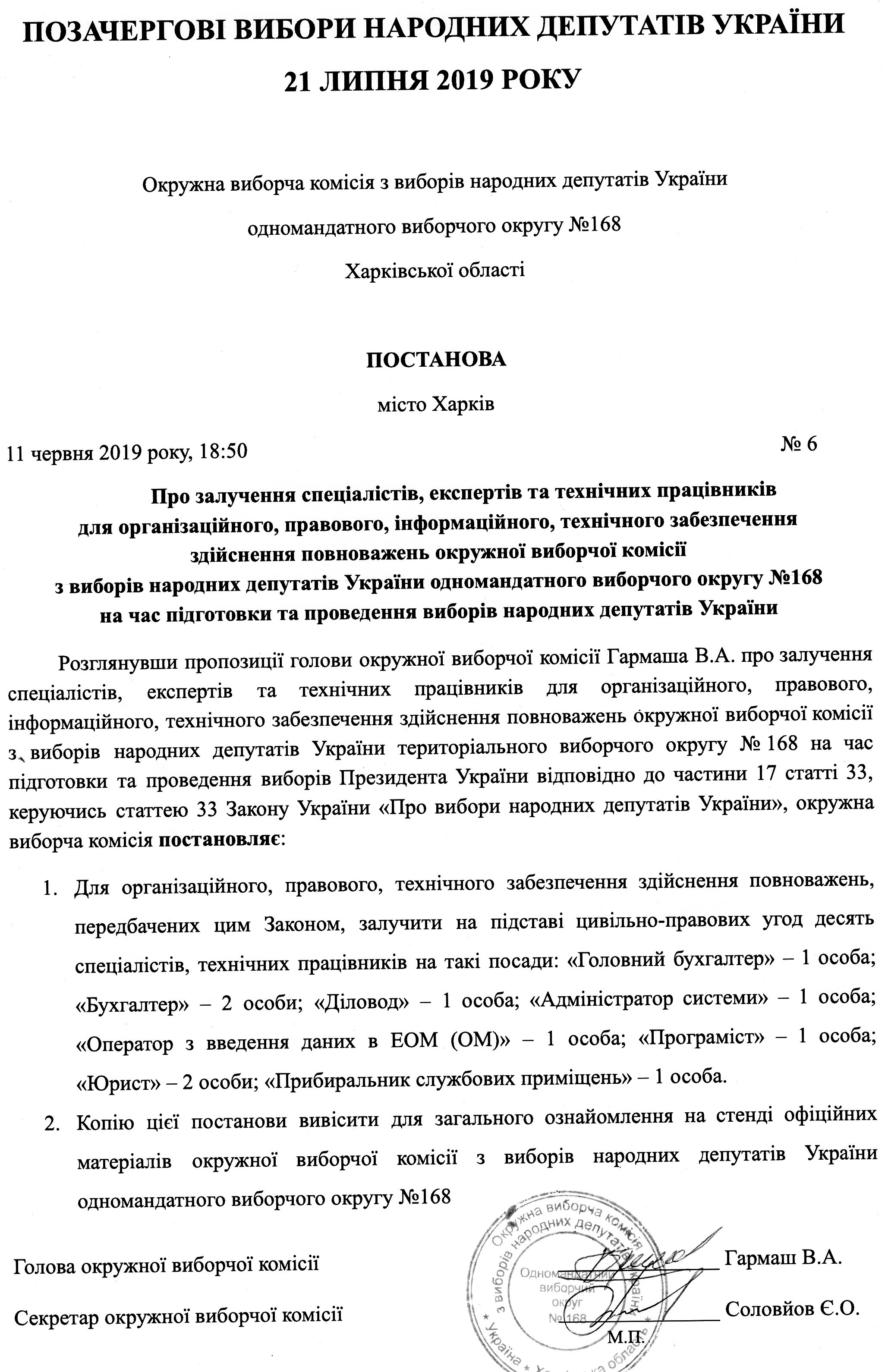 Про залучення спеціалістів, експертів та технічних працівників для організаційного, правового, інформаційного, технічного забезпечення здійснення повноважень ОВК з виборів народних депутатів України одномандатного виборчого округу №168 на час підготовки та проведення виборів народних депутатів України |