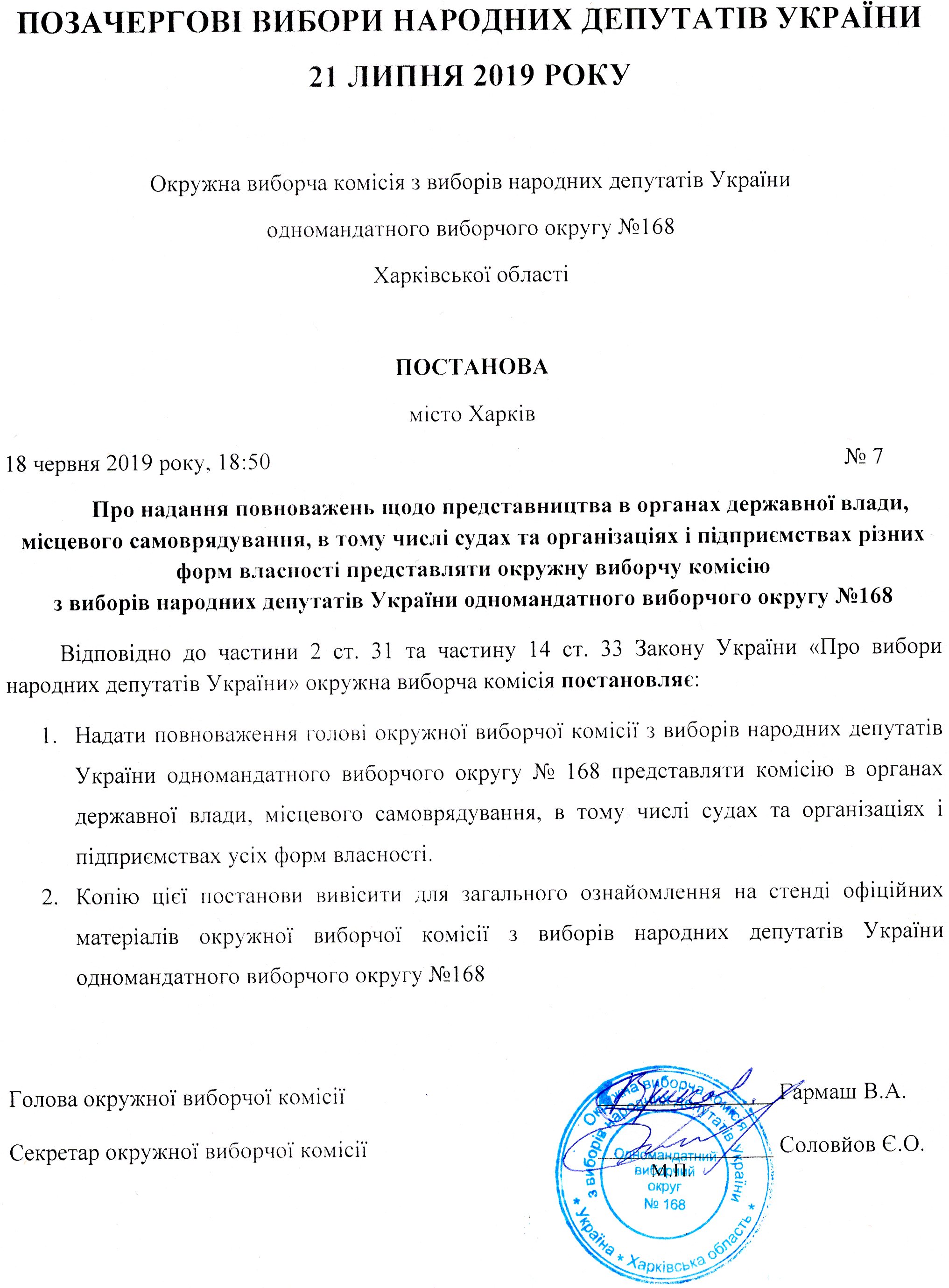 Про надання повноважень щодо представництва в органах державної влади, місцевого самоврядування, в тому числі судах та організаціях і підприємствах різних форм власності представляти ОВК з виборів народних депутатів України ОВО №168 |