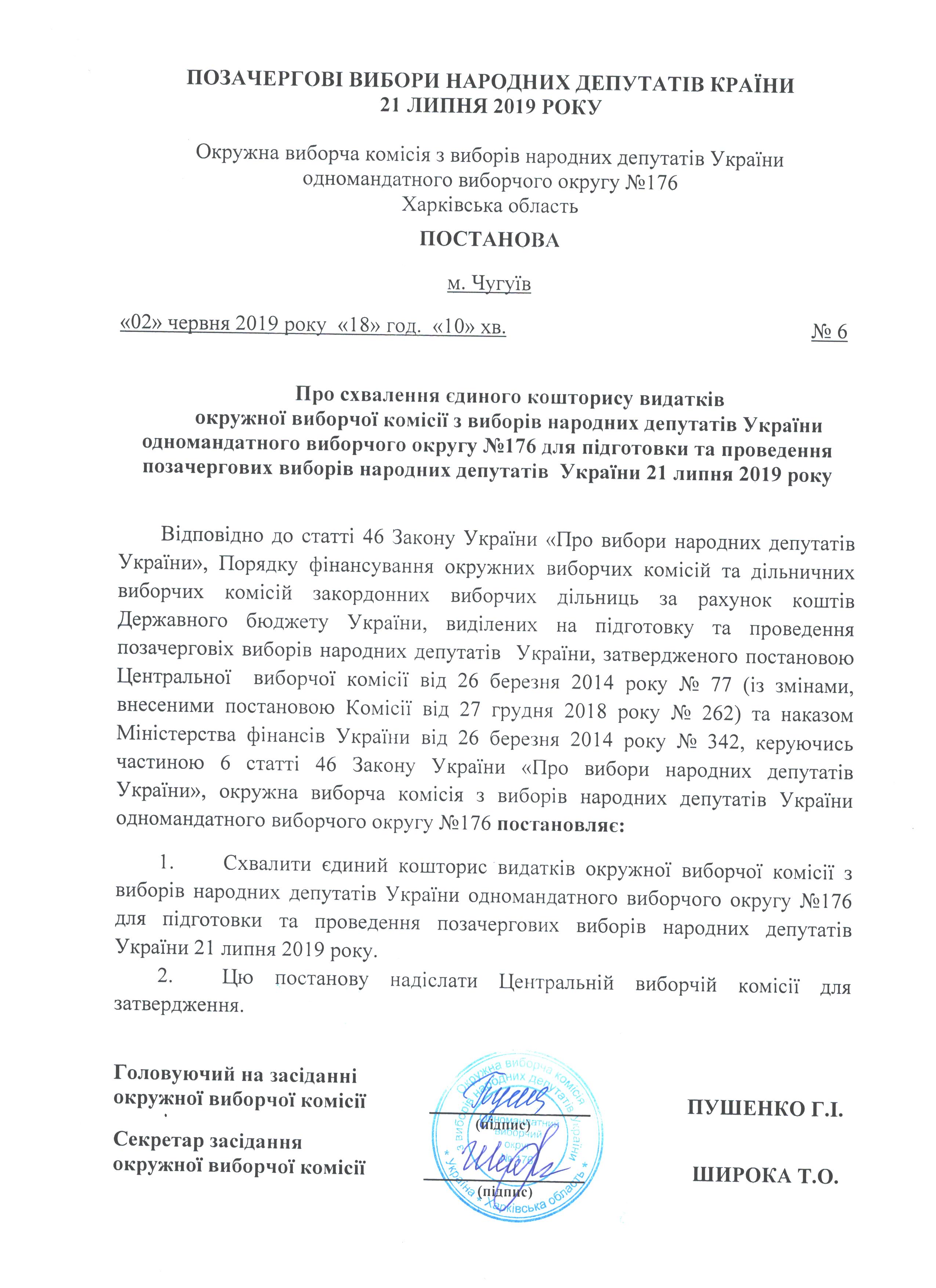 Про схвалення єдиного кошторису видатків ОВК з виборів народних депутатів України ОВО №176 для підготовки та проведення позачергових виборів народних депутатів України 21 липня 2019 року |