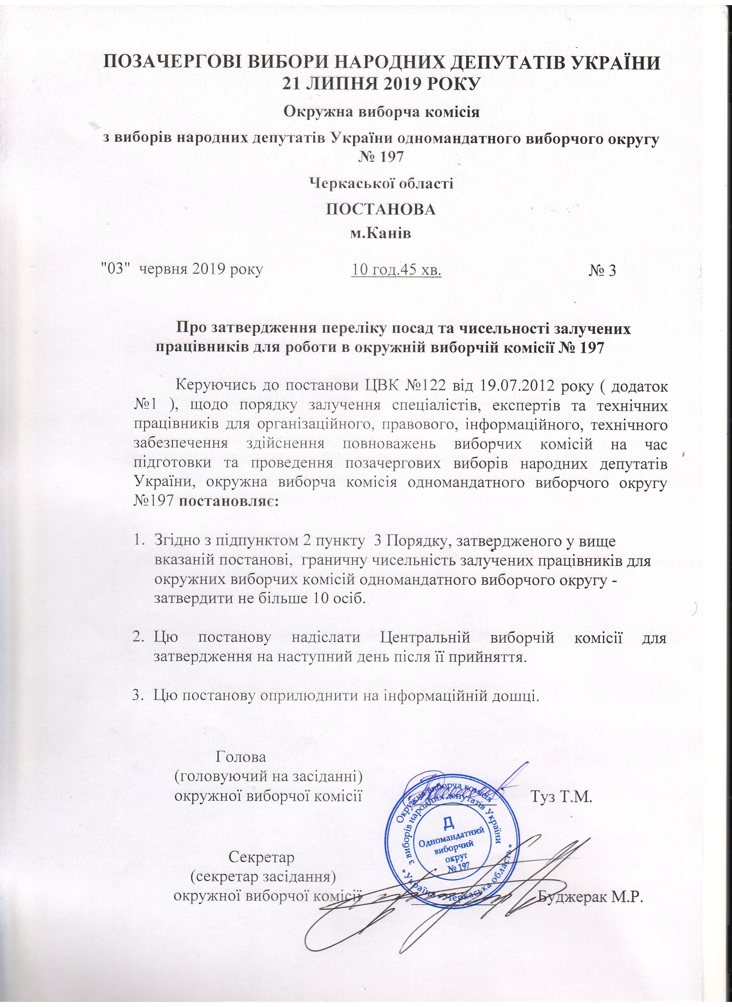 Про затвердження переліку посад, та чисельності залучених працівників для роботи в ОВК № 197 |