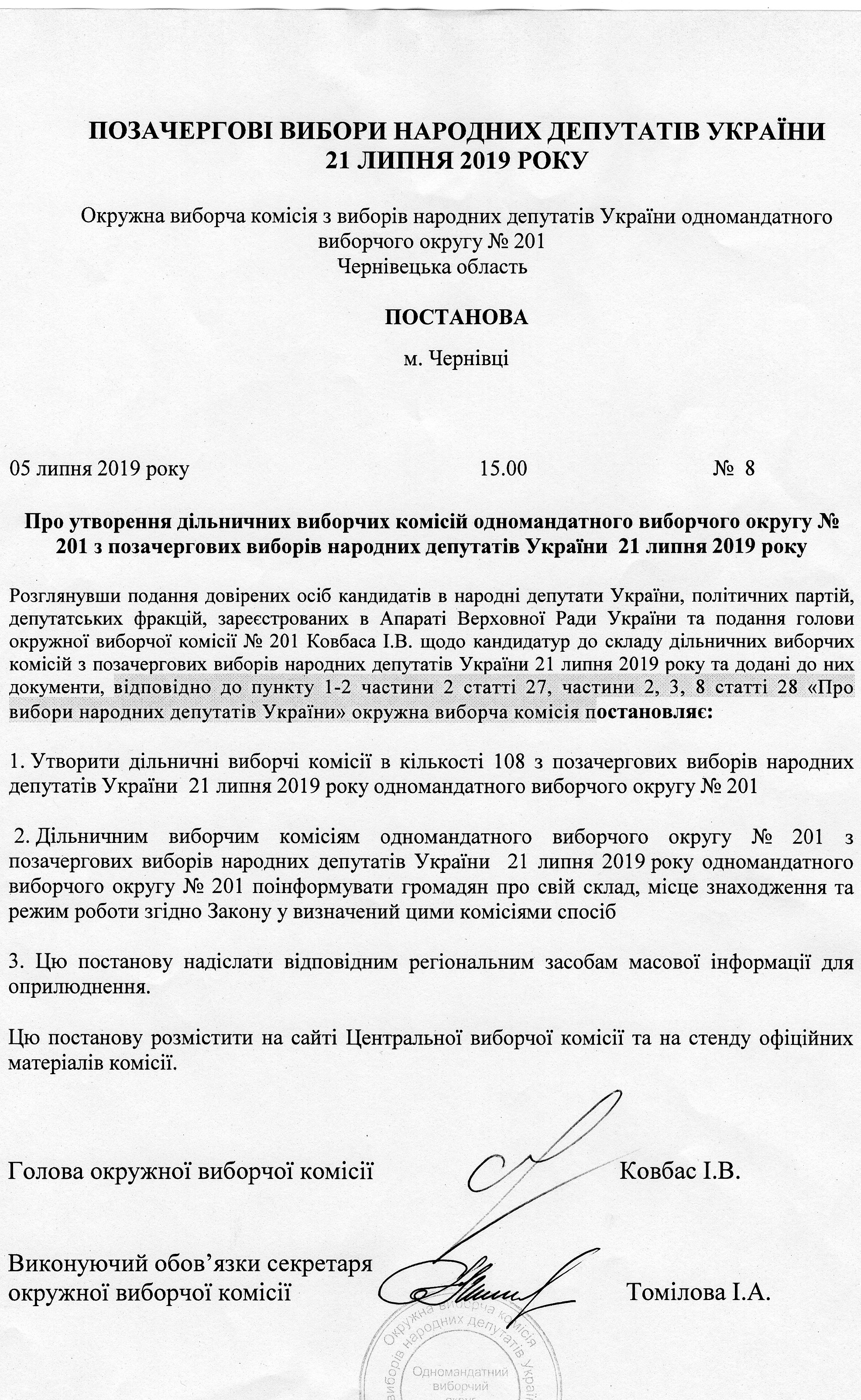 Про утворення дільничних виборчих комісій одномандатного виборчого округу № 201 з позачергових виборів народних депутатів України 21 липня 2019 року |