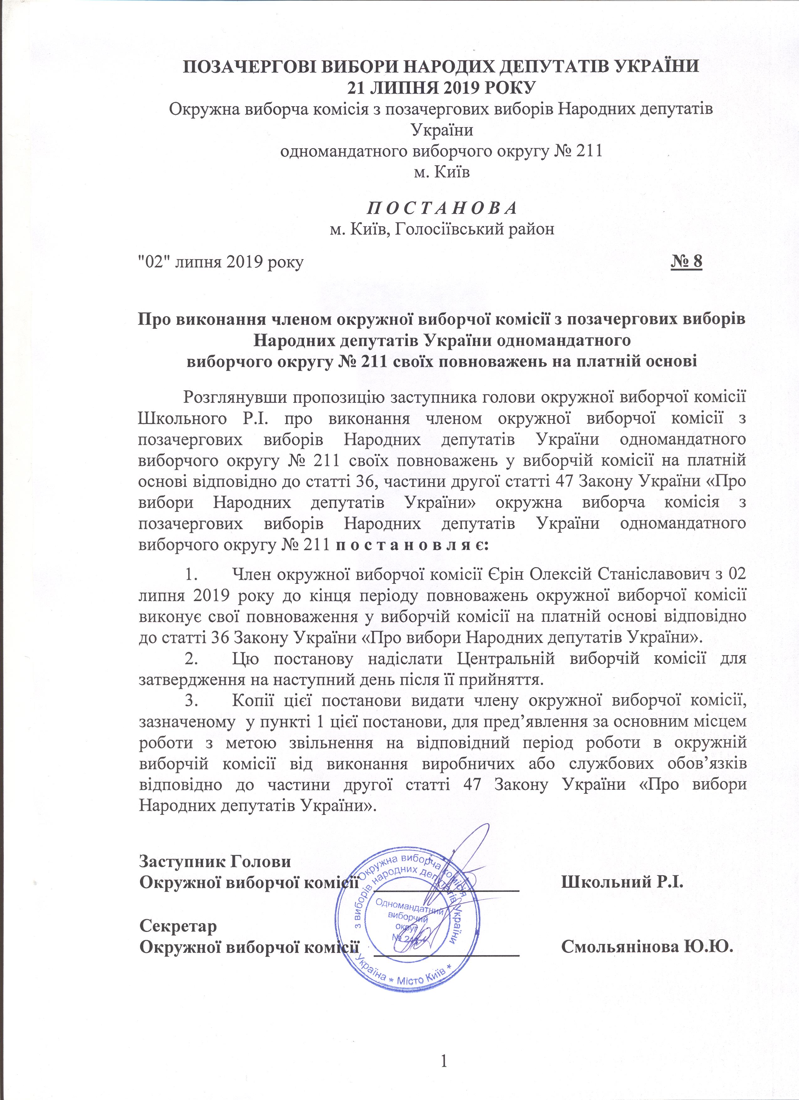 Про виконання членом окружної виборчої комісії з позачергових виборів Народних депутатів України одномандатного виборчого округу №211 своїх повноважень на платній основі |