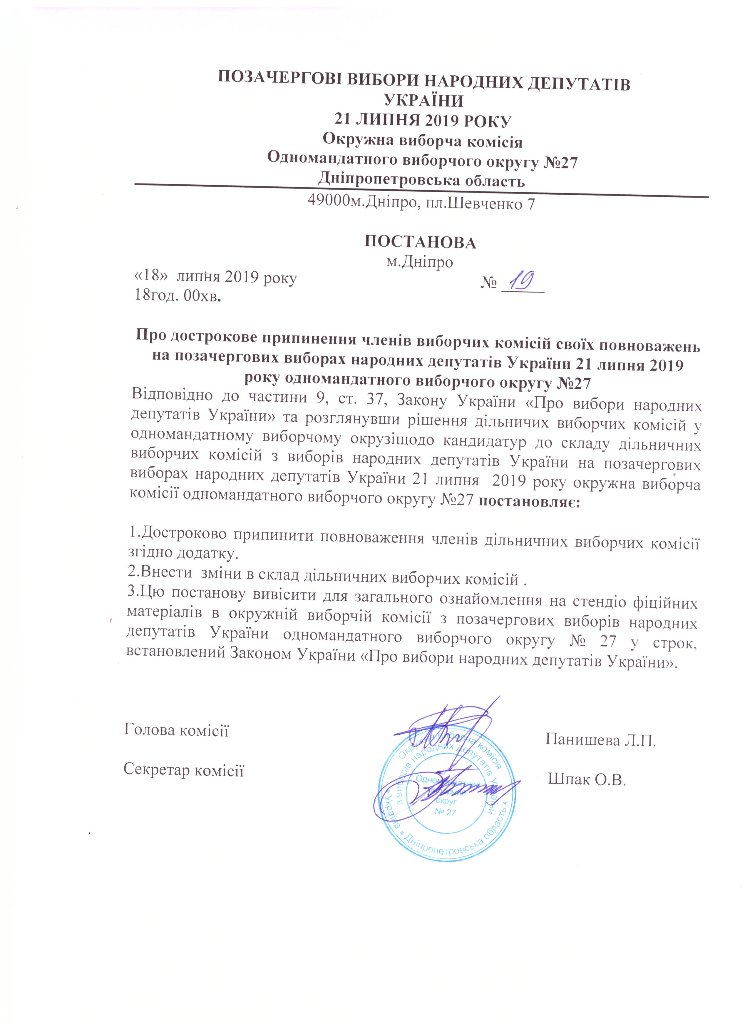 Про дострокове припинення членів виборчих комісій своїх повноважень на позачергових виборах народних депутатів України 21 липня 2019 року одномандатного виборчого округу №27 |