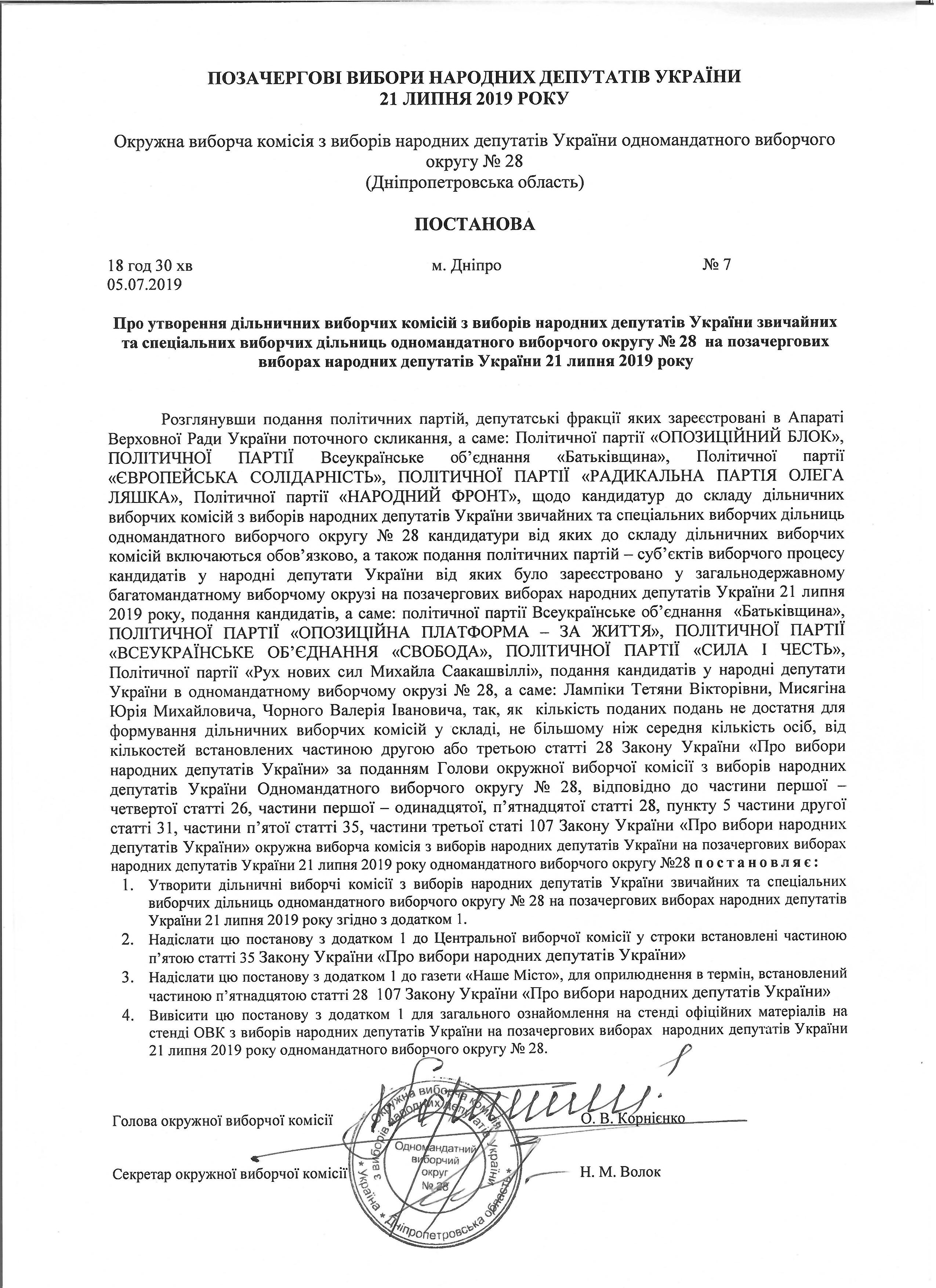 Про утворення дільничних виборчих комісій з виборів народних депутатів України звичайних та спеціальних виборчих дільниць одномандатного виборчого округу № 28 на позачергових виборах народних депутатів України 21 липня 2019 року |