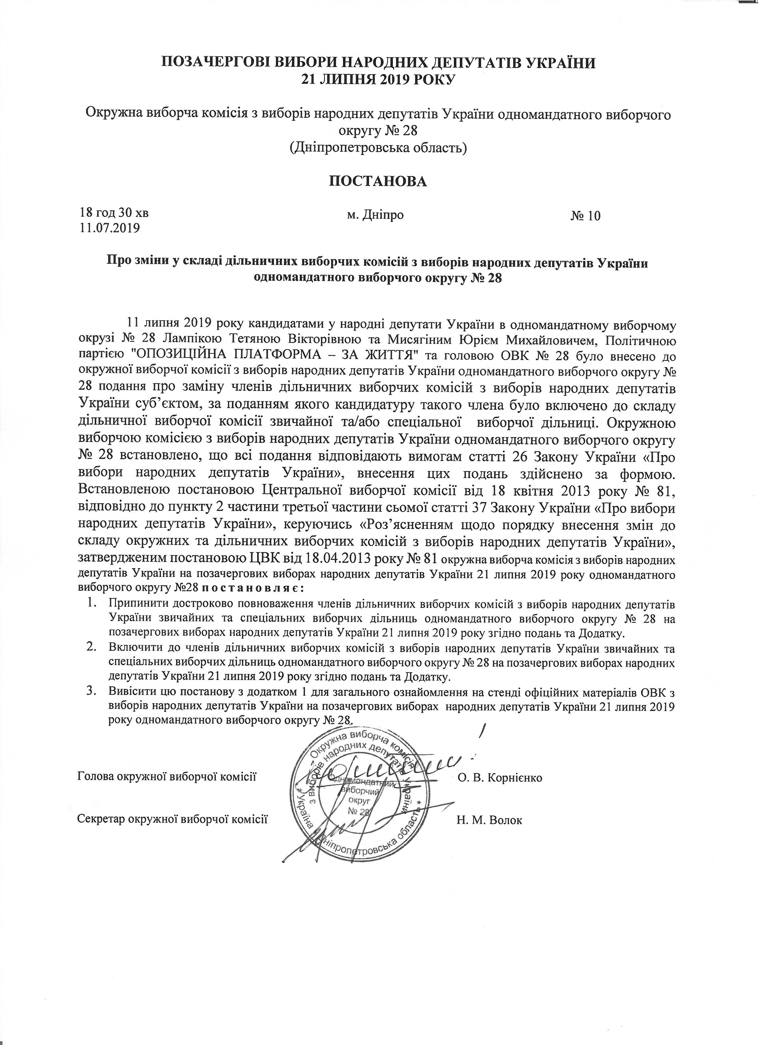 Про реєстрацію офіційних спостерігачів на позачергових виборах народних депутатів України 21 липня 2019 року у одномандатному виборчому окрузі № 28 |