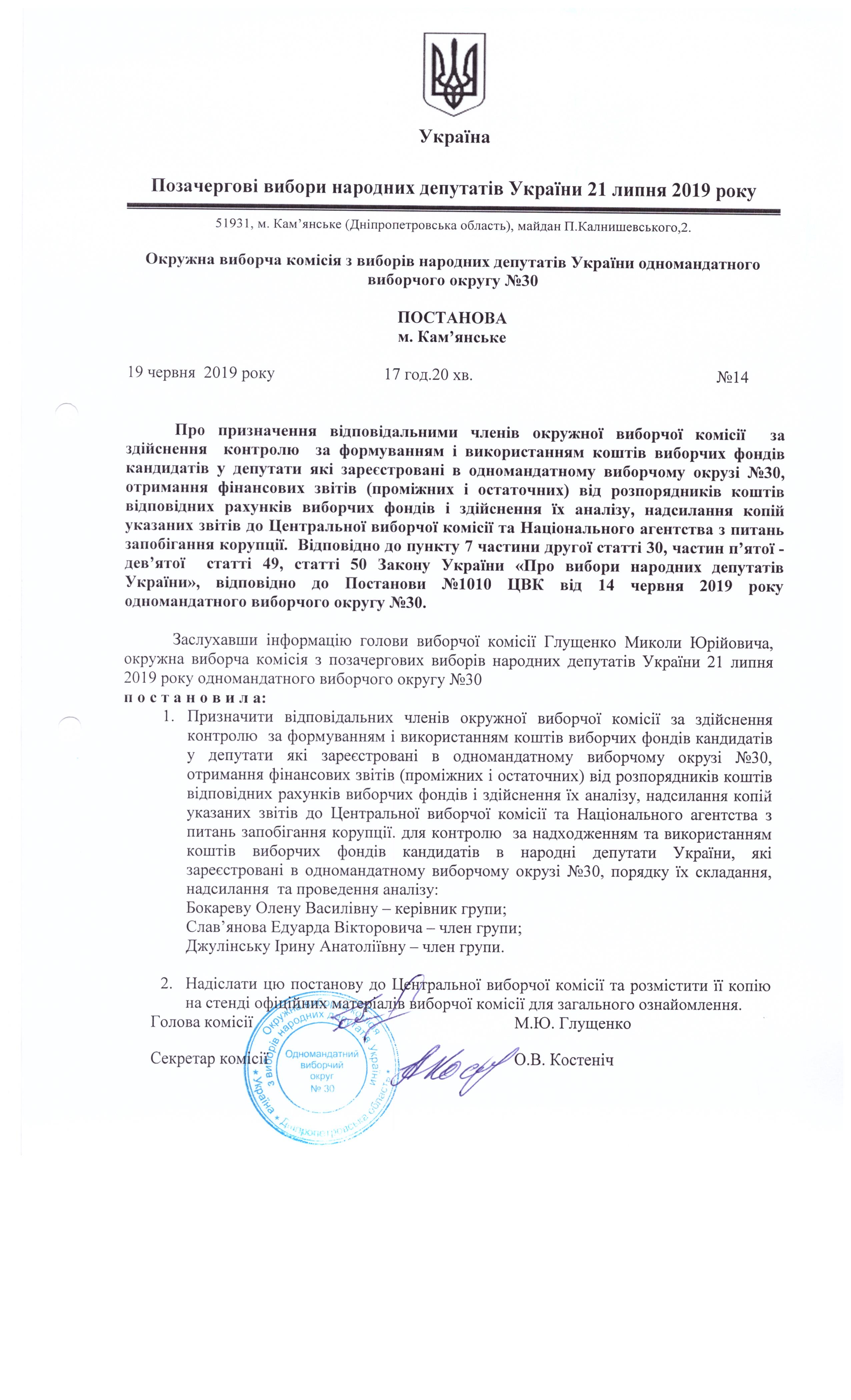 Про призначення відповідальними членів окружної виборчої комісії за здійснення контролю за формуванням і використанням коштів виборчих фондів кандидатів у депутати які зареєстровані в одномандатному виборчому окрузі №30, отримання фінансових звітів (проміжних і остаточних) від розпорядників коштів відповідних рахунків виборчих фондів і здійснення їх аналізу, надсилання копій указаних звітів до Центральної виборчої комісії та Національного агентства з питань запобігання корупції. |
