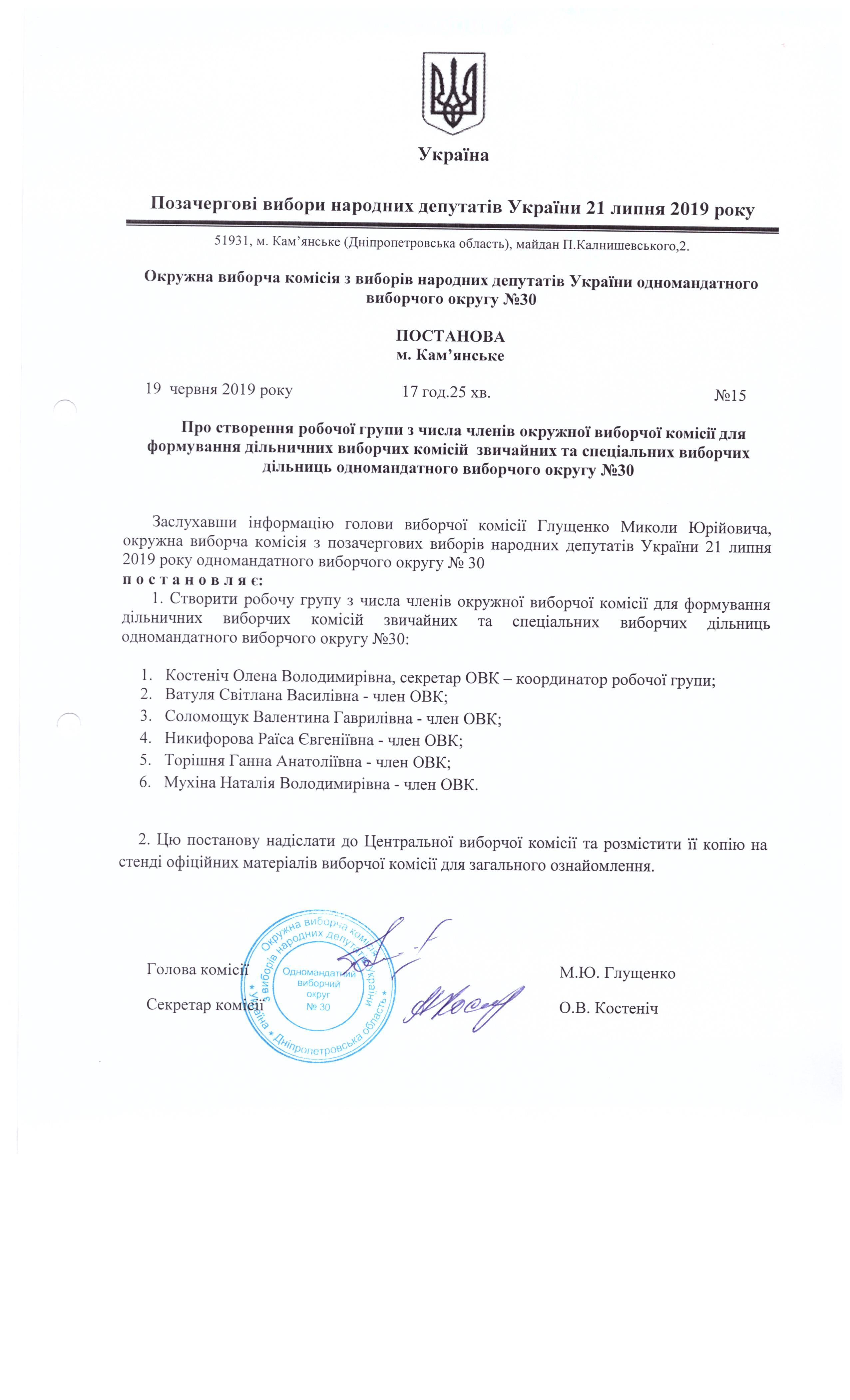 Про створення робочої групи з числа членів окружної виборчої комісії для утворення дільничних виборчих комісій звичайних та спеціальних виборчих дільниць одномандатного виборчого округу № 30 |