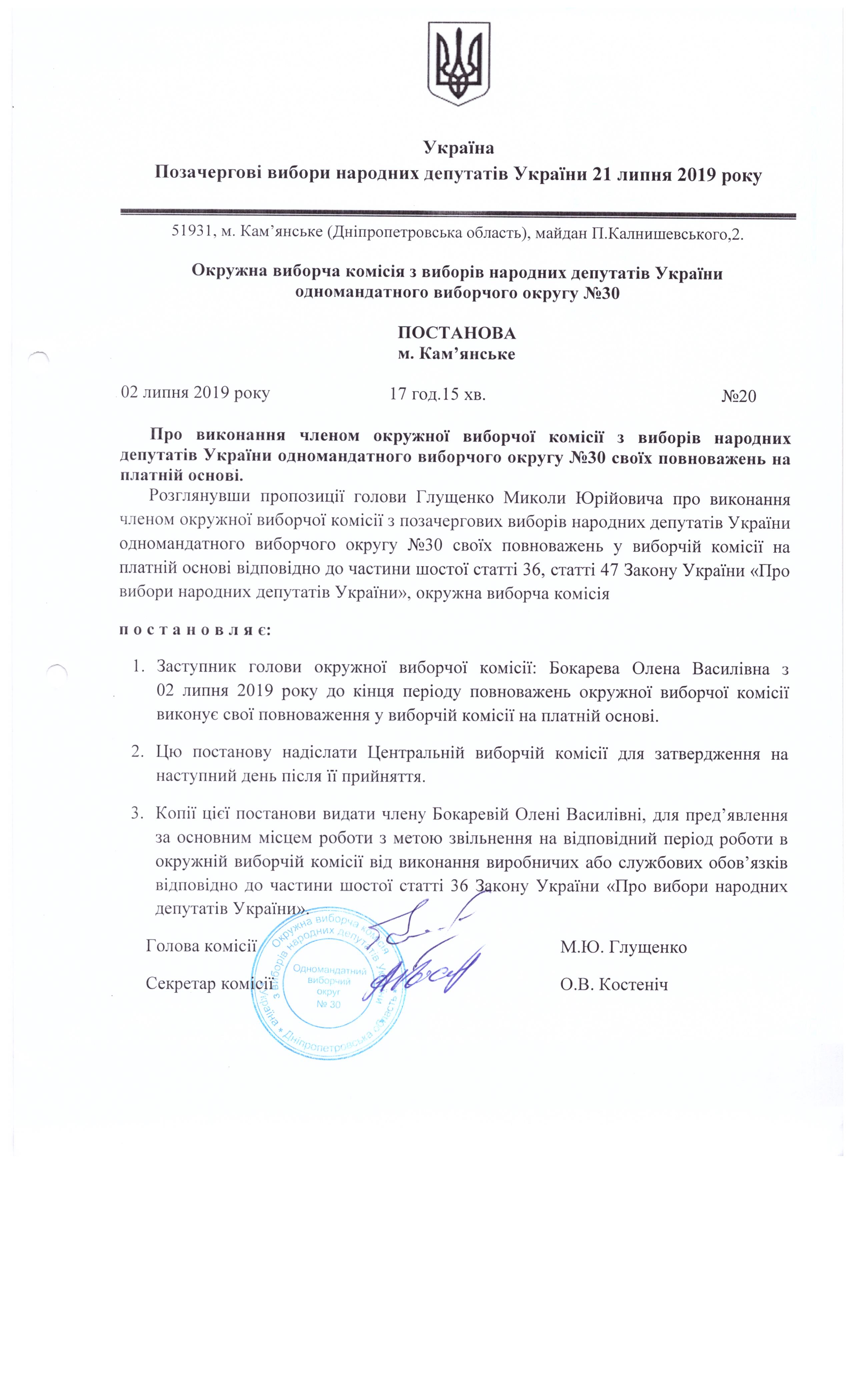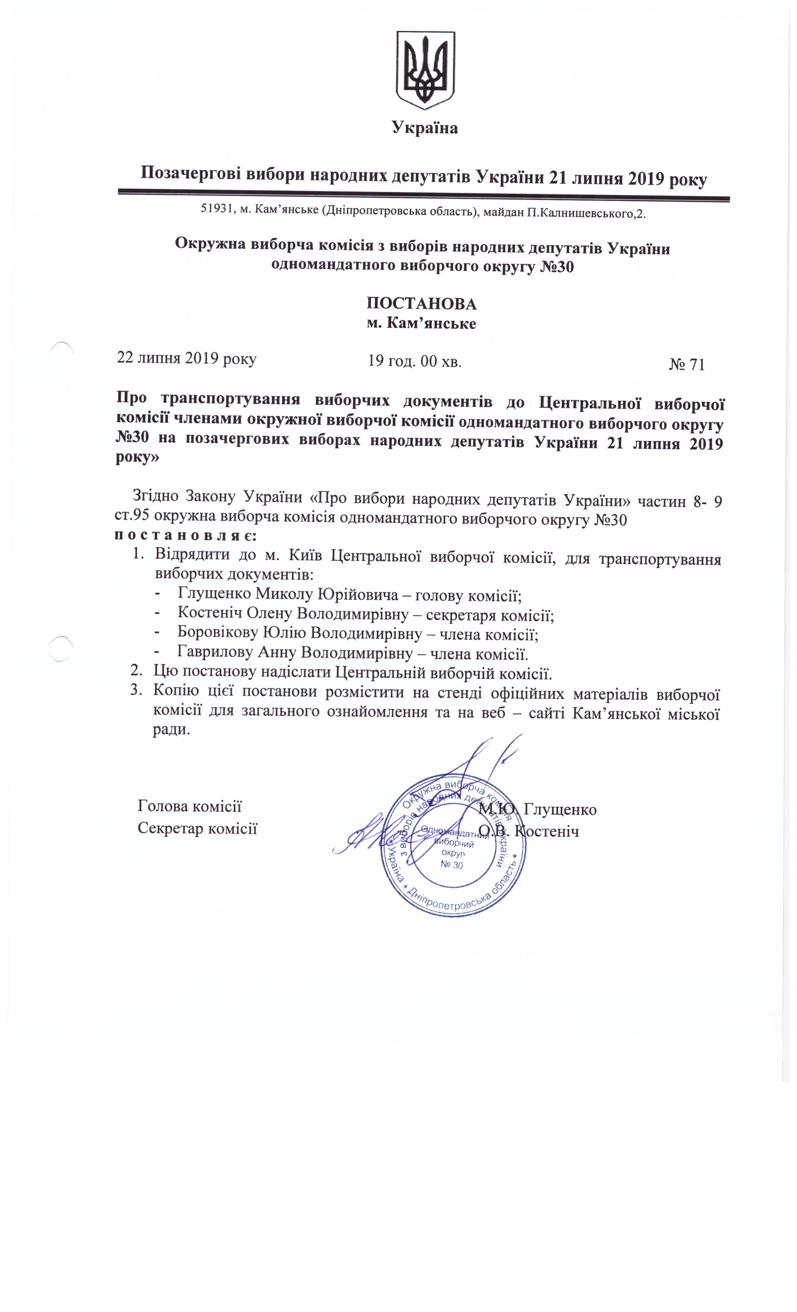 Про транспортування виборчих документів до Центральної виборчої комісії членами окружної виборчої комісії одномандатного виборчого округу № 30 на позачергових виборах народних депутатів України 21 липня 2019 року |