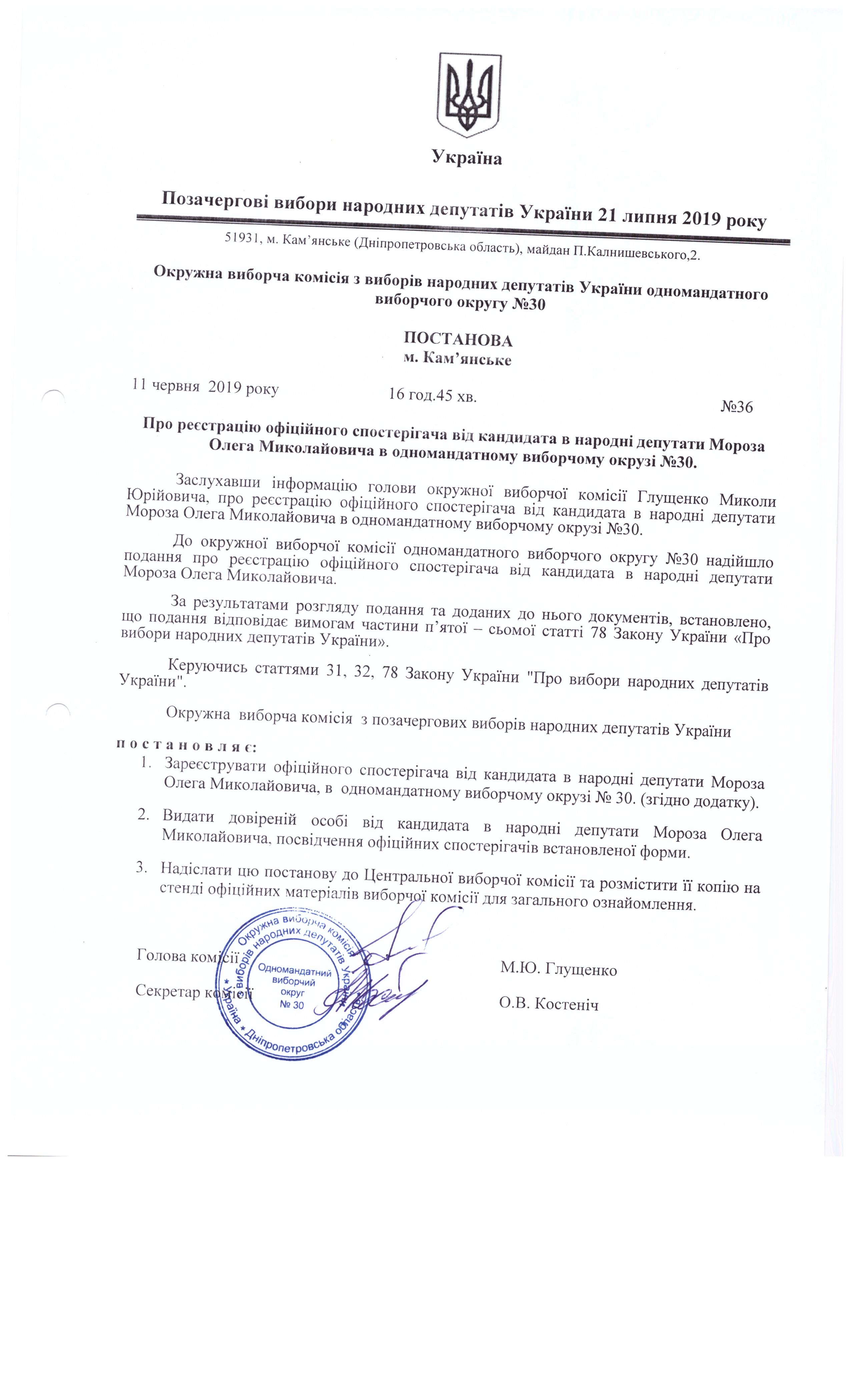 Про реєстрацію офіційного спостерігача від кандидата в народні депутати Мороза Олега Миколайовича в одномандатному виборчому окрузі №30 |