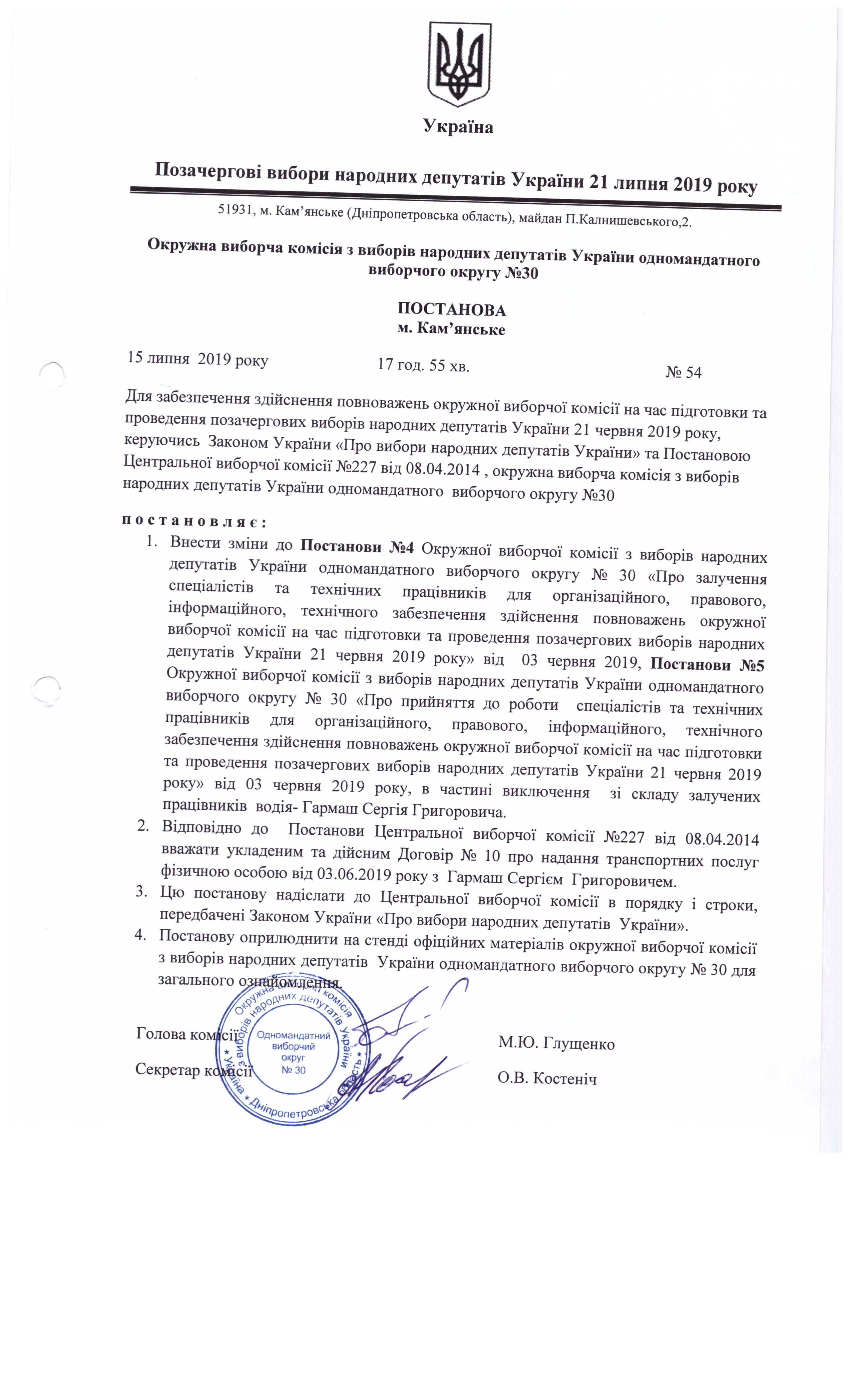 Про зміни в складі дільничних виборчих комісій з позачергових виборів депутатів України 21 липня 2019 року звичайних та спеціальних виборчих дільниць одномандатного виборчого округу № 30 |