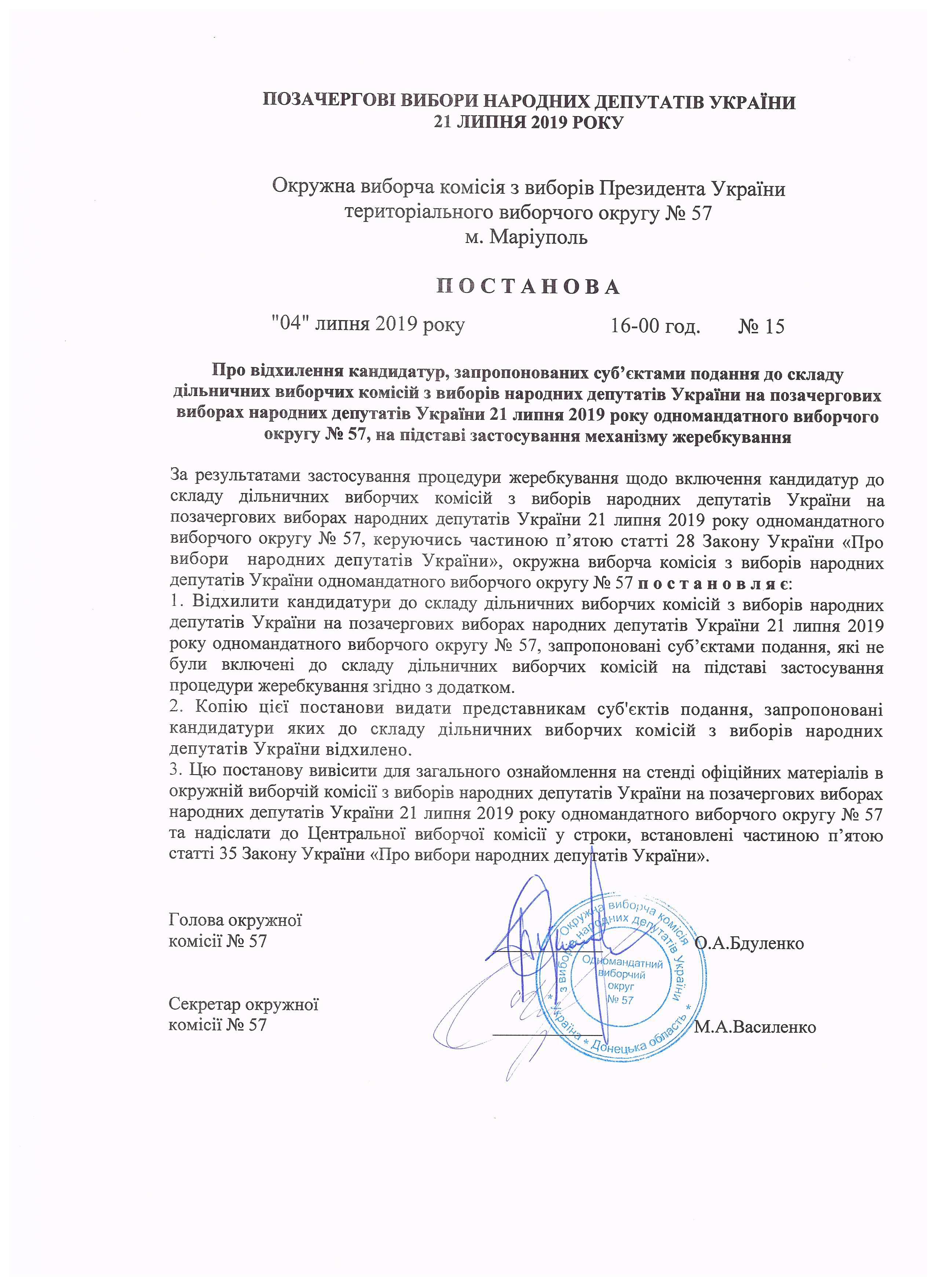 Про відхилення кандидатур, запропонованих окремими суб'єктами подання до складу ДВК з виборів народних депутатів України 21 липня 2019 року ОВК № 57 |